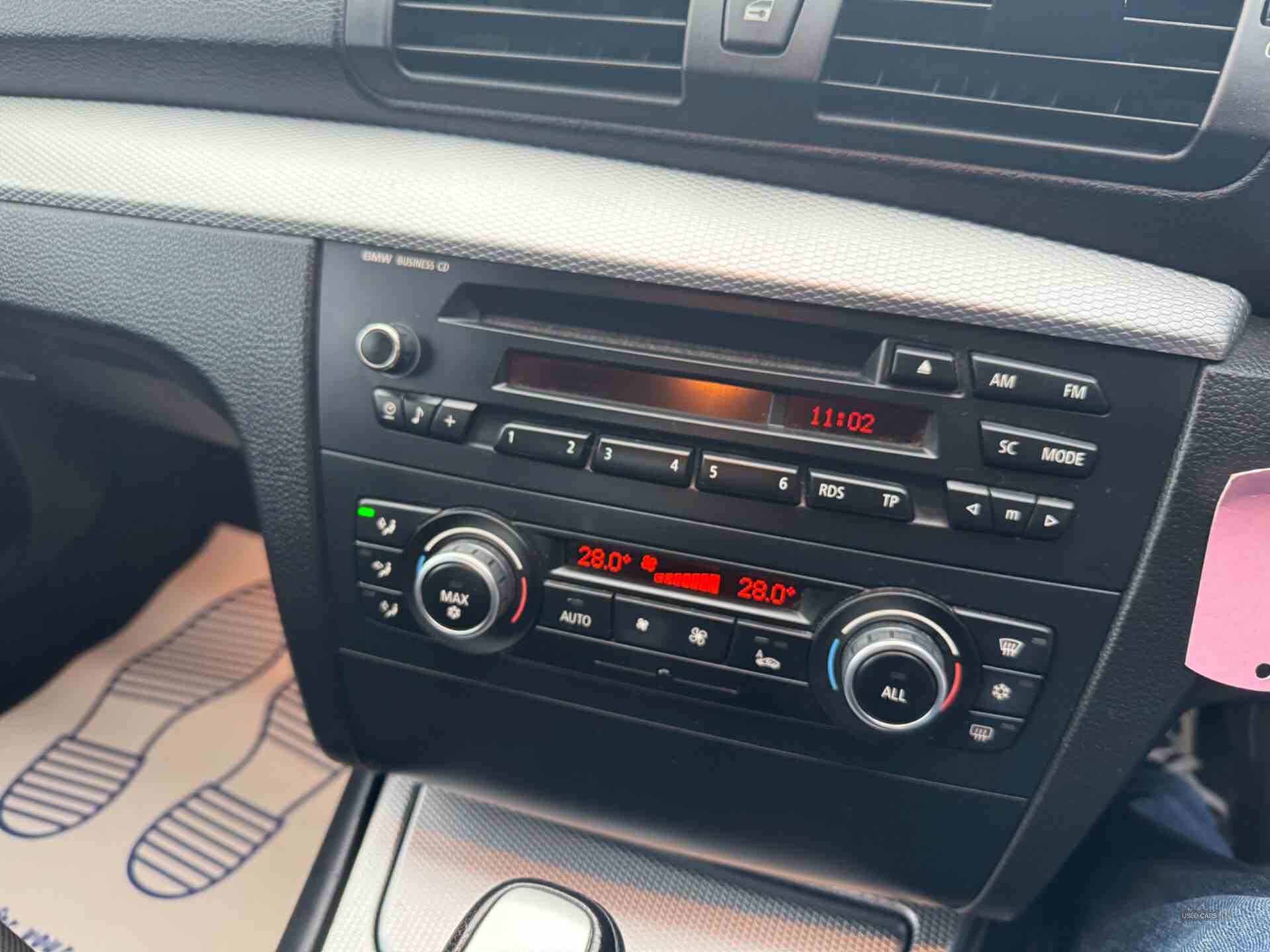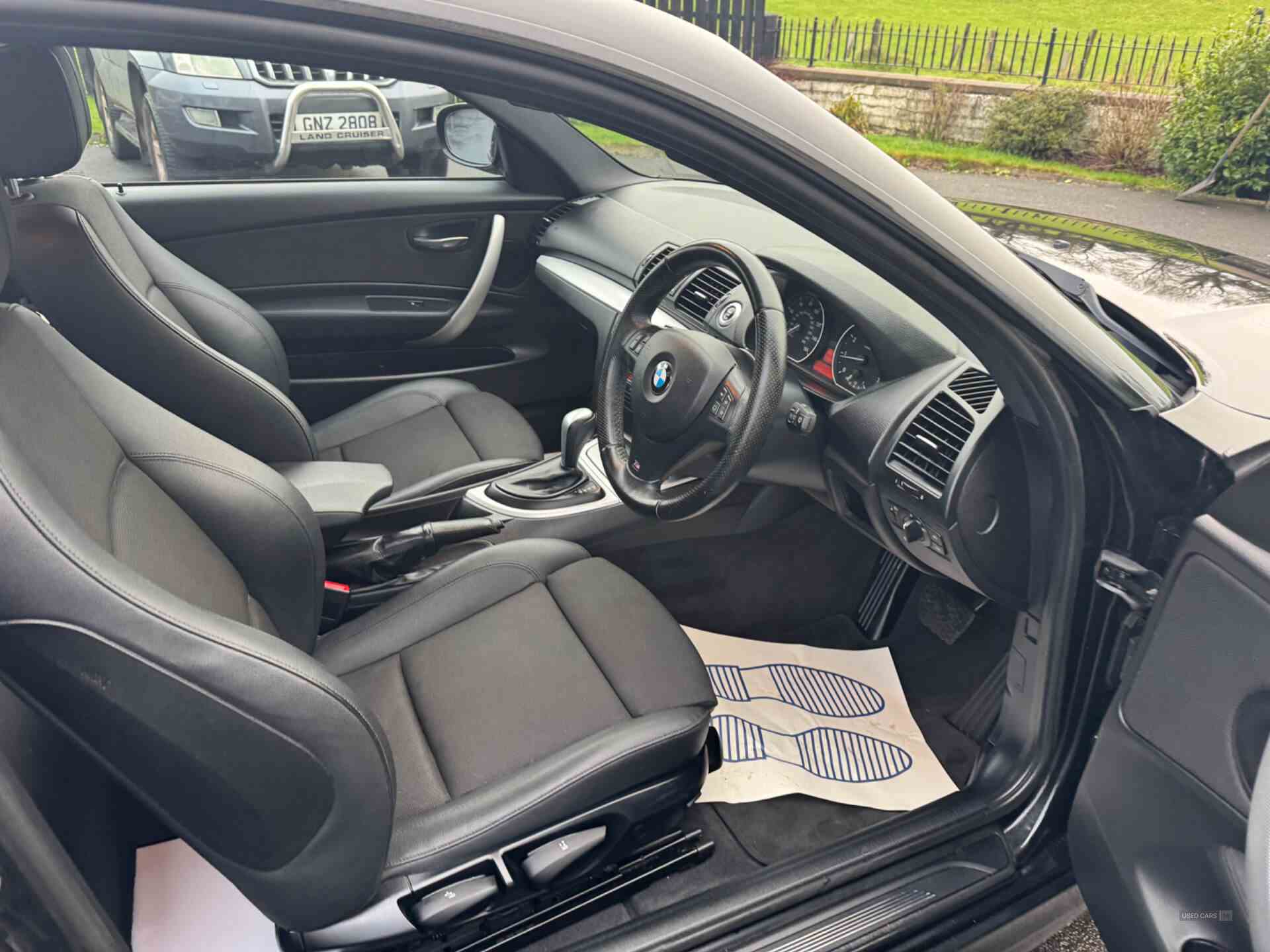 Brake force display, Engine start/stop button, Lights on warning, Oil level indicator, On board computer, On-board diagnosis - OBD, Outside temperature display, Run flat tyre indicator, Service interval indicator, Trip computer, Auxiliary point for auxiliary devices, Auto dimming rear view mirror, Body colour door handles, Body colour exterior mirrors, Body coloured bumper strips, Body coloured bumpers, Electric front windows - anti trap + one touch, Electric internally adjustable exterior mirrors, Front fog lights/heated windscreen washer jets/heated door mirrors, Kidney grille with black vertical slats, Twin matt chrome round exhaust pipes, Windscreen wipers with adjustable interval, 12V power socket in centre console, 3 spoke leather M multi-function steering wheel, 60/40 split folding rear seat, Air microfilter, Automatic air conditioning + active carbon filter, Chrome door sill finishers with M logo, Driver/passenger sunvisors with ticket holders + vanity mirrors, Floor mats, Front centre armrest with storage compartment, Front head restraints, Front passenger isofix child seat attachment, Front sports seats with electric side bolster adjustment, Front/rear courtesy lights with soft on/off dimming, Individual anthracite headlining, Isofix rear child seat fastenings, Leather gear lever, Leather handbrake, Luggage strap, Luggage tie-down hooks, Reach + rake adjustable steering column, Rear adjustable/removable head restraints, Rear seat easy access, Toolkit located in luggage compartment, Enhanced lighting pack - 1 Series Coupe, M Aerodynamic pack - 1 series, 2 rear 3 point inertia reel seatbelts, 3 point inertia reel seatbelts on front seats, ABS, ASC+T, CBC - (Cornering brake control), Crash sensor, Driver/Passenger airbags (Impact dependent), DSC+, Dynamic brake control, Dynamic Traction Control - DTC, Electronic brake force distribution, Front side airbags, ITS head airbags for front/rear, Pyrotechnically pre-tensioned front seatbelts, Seat belt force limiter, Warning triangle and first aid kit, Remote alarm system/immobiliser, Remote central locking, Run flat tyres