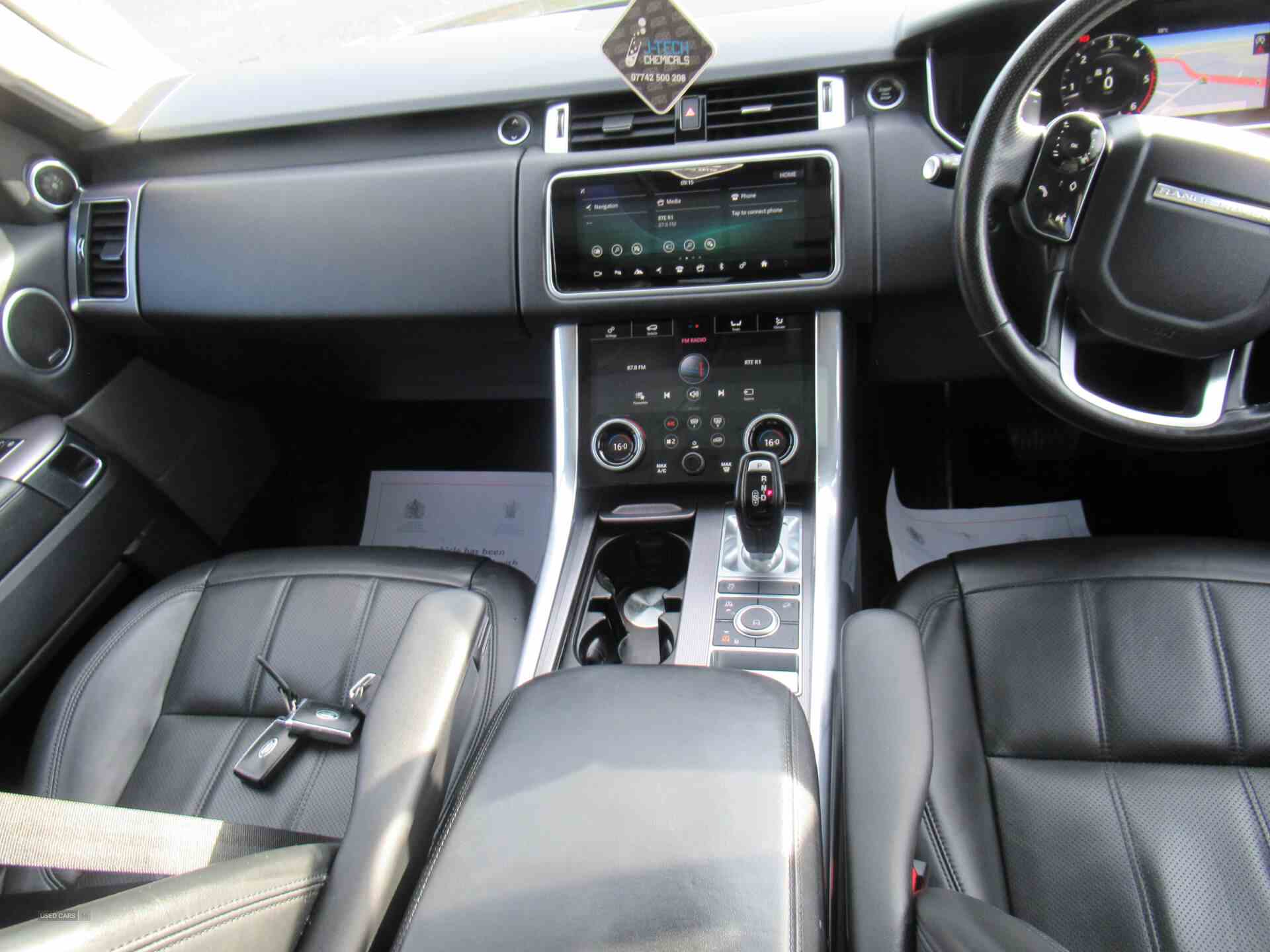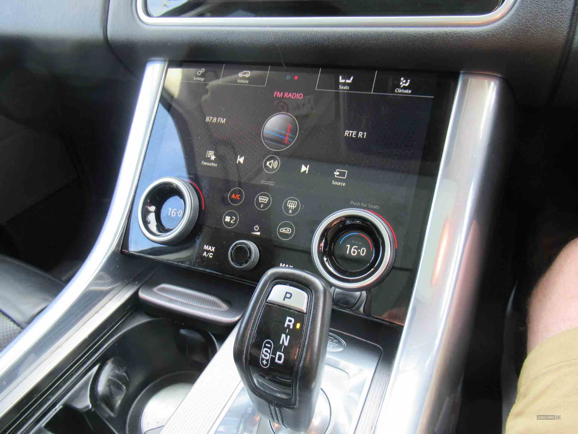 Bluetooth telephone connection, Front parking aid with visual display, Gesture tailgate, InControl secure, Mist sensor, Navigation pro system with 10" touch screen, app interface and media storage, Push button starter, Rear park distance control, Speed sensitive power steering, TFT Virtual Instrument Panel, Trip computer, Bluetooth audio streaming, DAB Digital radio, InControl protect, USB/aux input socket, Adaptive brake lights, Auto dimming rear view mirror, Body coloured bumpers, Body coloured door mirrors, Daytime running lights, Door/quarter lights in toughened plate glass, Electric front/rear windows/one touch operation, Electric heated, adjustable, folding door mirrors with memory + approach lamp, Follow me home headlights, Front fog lights, Heated rear window, Heated washer jets, Heated windscreen, Laminated front side windows, Laminated windscreen, LED rear lamps, Rain sensor windscreen wipers, Rear wash/wipe, Remote window closing, Trailer stability assist, 2 way active front head restraints, 2 way rear head restraints, Auto air recirculation, Centre armrest with cubby box, Climate control memory, Driver's footrest, Front and rear cupholders, Front door storage bin, Front map lights, Front seat back map pockets, Front stowage pocket, Front/rear passenger grab handles, Glovebox, Isofix child seat preparation, Leather steering wheel, Luggage compartment lighting, Multifunction steering wheel, Pollen filter, Reach/rake electric adjustable steering column + entry/exit tilt away, Rear centre armrest, Roller blind loadspace cover, Three 12V accessory power outlets, InControl connect Pack - Range Rover Sport, 3 point seatbelts on all seats, ABS + EBD + EBA, Auto lock system when vehicle in motion, Auto locking differential, CBC - (Cornering brake control), Curtain airbags, DSC - Dynamic Stability Control, Dual stage Driver/Passenger Airbags, Electric child locks, Electronic parking brake, Electronic traction control, Front seatbelt pretensioners, Front side airbags, Height adjustable front seatbelts, Hill descent control, Low traction launch, Roll stability control, Seatbelt warning, Tyre pressure monitoring system, Immobiliser, Keyless entry, Locking wheel nuts, Perimetric and volumetric anti theft alarm, Remote locking, Adaptive dynamics