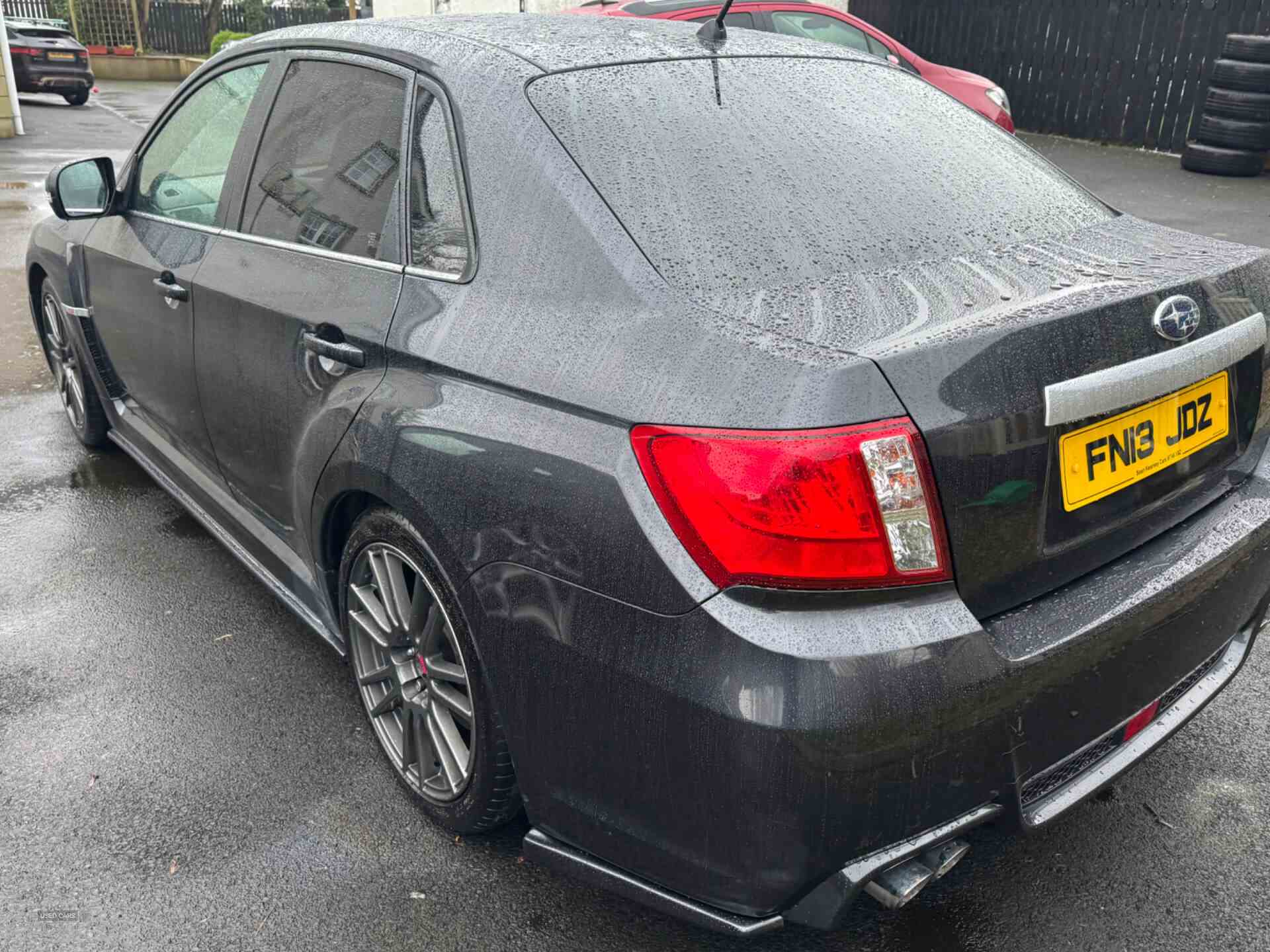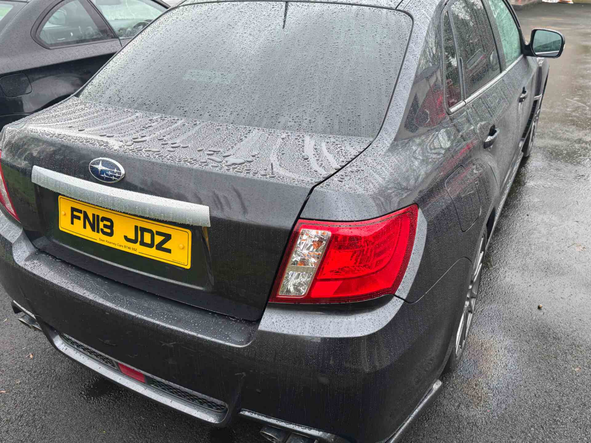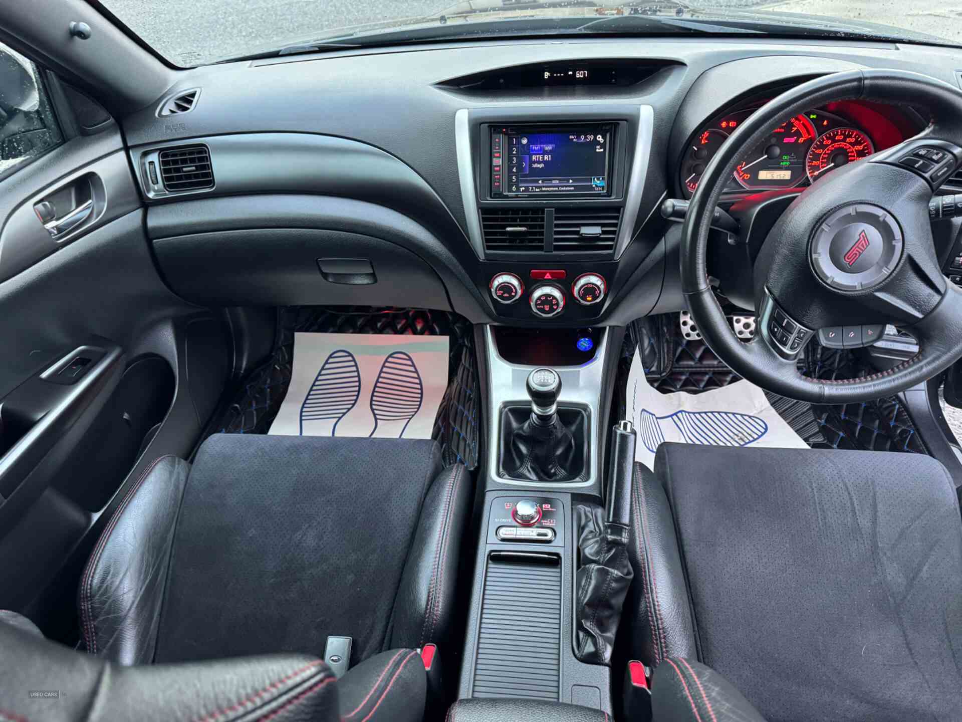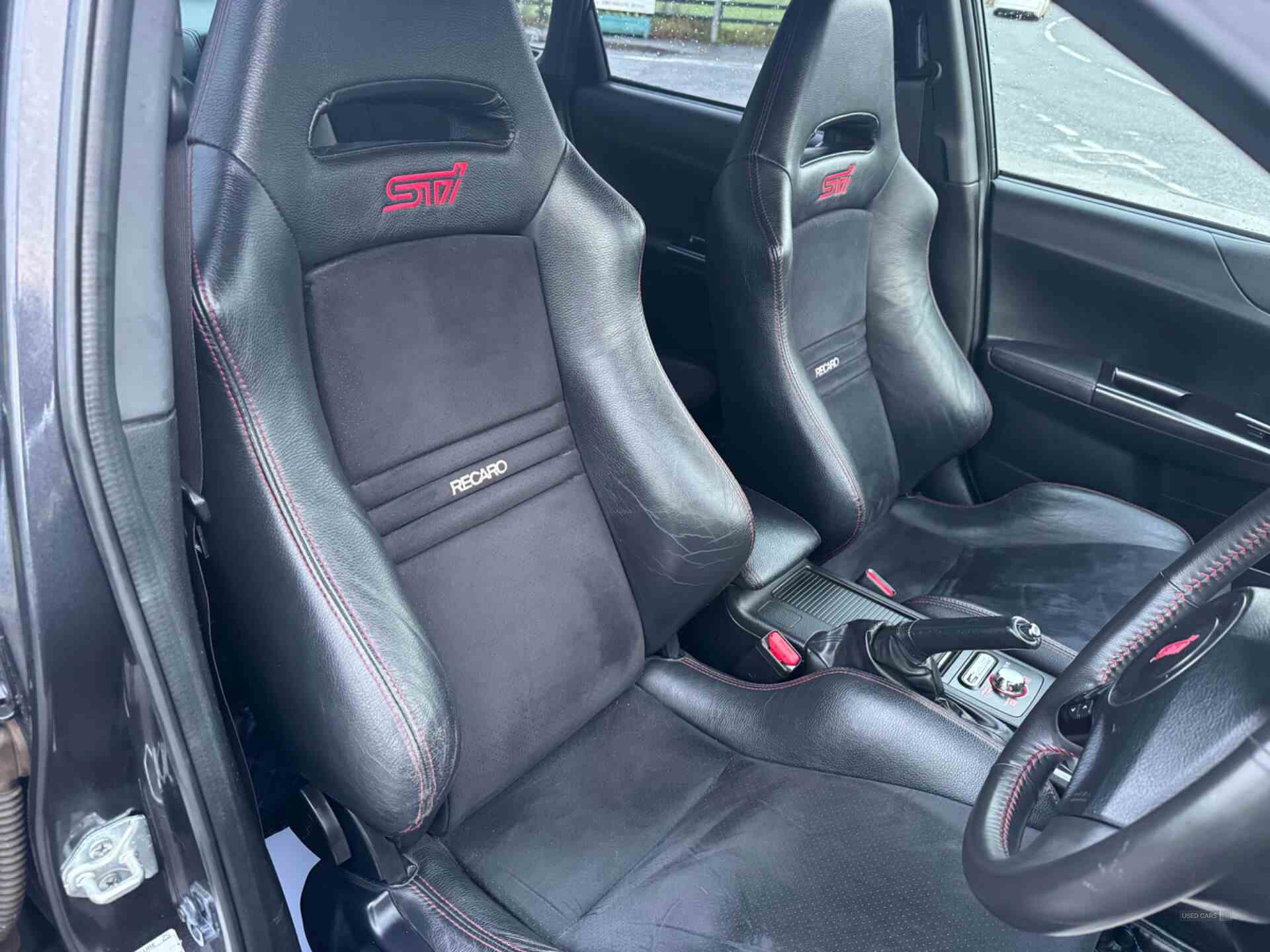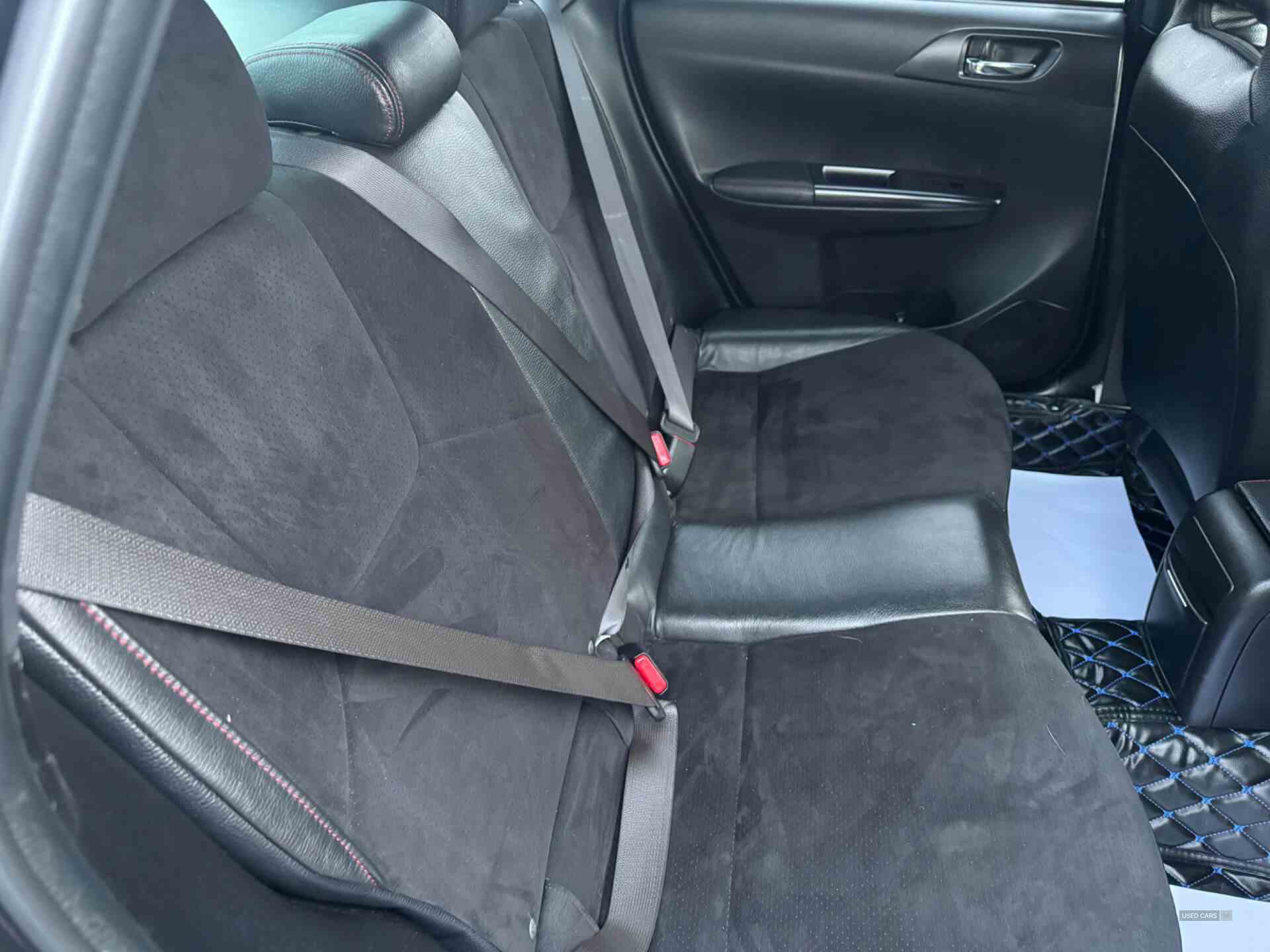 Bluetooth system, Cruise control, Electric boot release, Electroluminescent combination meter, Interior fuel flap release, Outside temperature gauge, Speed sensitive power steering, Trip computer, 10 speakers, Auxiliary socket for external MP3 player, Radio/CD + MP3, Steering wheel mounted audio/telephone controls, Colour coded bumpers, Colour coded door handles, Colour coded door mirrors, Electric/heated/folding door mirrors, Front and rear electric windows, Front fog lamps, Heated windscreen, One touch facility on driver's window, Pop-up headlight washers, Rear privacy glass, Roof rack preparation, Side sill spoilers, Twin chrome exhaust tailpipes x2, Variable intermittent front wash/wipe, Windscreen wiper de-icer, Xenon headlamps with auto levelling, 60/40 split folding rear seat, Air filter, Alcantara/leather upholstery, Aluminium pedals, Automatic air conditioning, Boot lamp, Driver seat height adjust, Driver/passenger vanity mirrors with covers, Front centre console with armrest, storage + dual cupholders, Front door pockets with bottle holders, Front head restraints, Front map reading lights, Height adjustable front seatbelts with pre-tensioners + clamp, Illuminated centre tray, Isofix child seat attachment, Leather gearknob and handbrake lever, Leather steering wheel with red stitching, Rear door pockets with bottle holders, Rear headrests, Rear passenger heating ducts, Rear window demister, Recaro front sports seats with red stitching, Tilt/reach adjustable steering wheel, Two 12V accessory power outlets, ABS/EBD, Curtain airbags, Driver and passenger airbags, Driver seatbelt warning indicator, Emergency brake assist, Front side airbags, Hill start assist, Rear child proof door locks, Three 3 point rear seatbelts, Keyless entry, Remote central locking + deadlocks, Remote Thatcham Cat 1 alarm/immobiliser, Satellite security tracking system, Sports suspension, SVDC - Subaru Vehicle Dynamics Control, Dark metallic effect interior trim, 18" 7 twin spoke alloy wheels, Space saver spare wheel