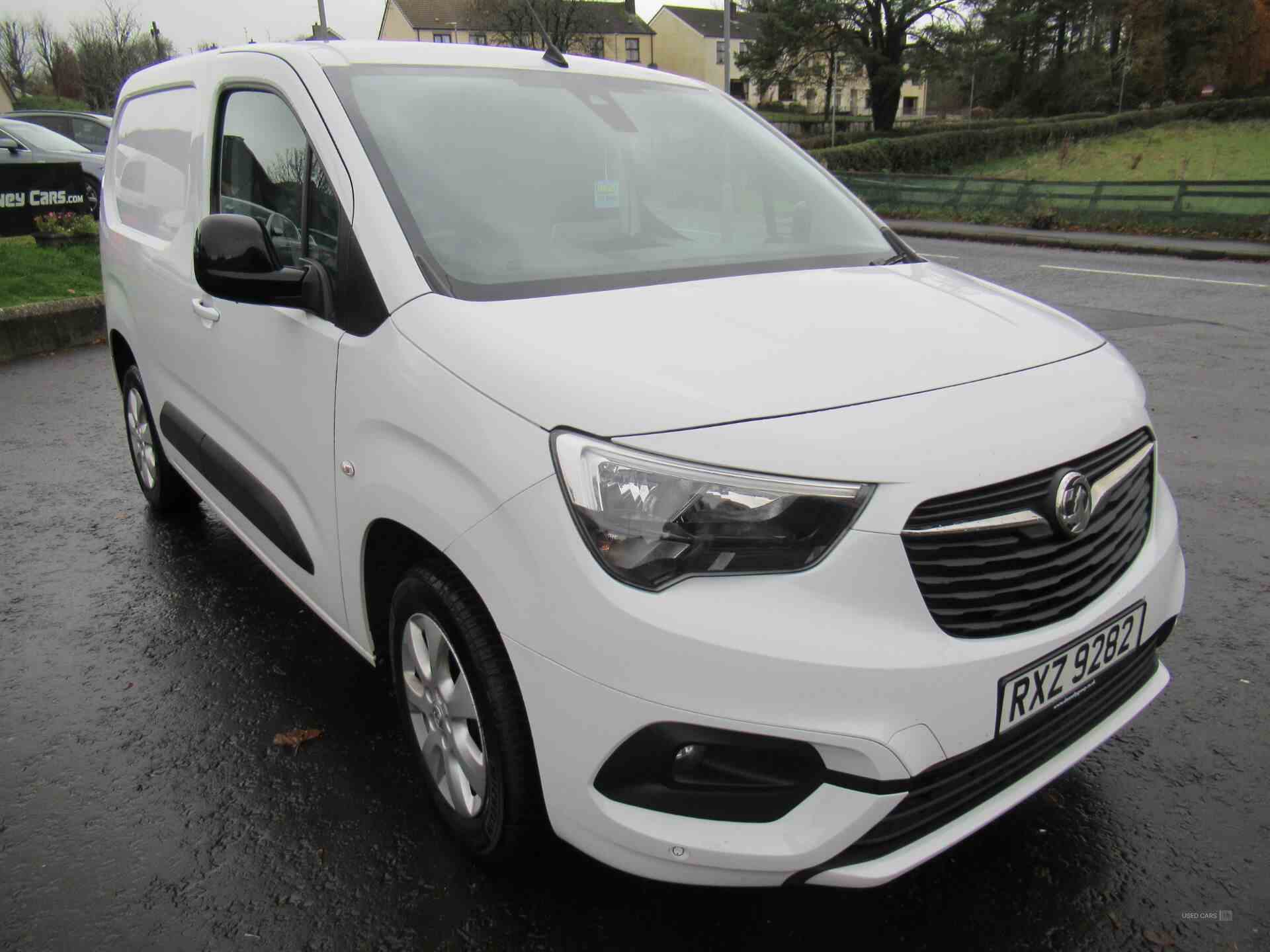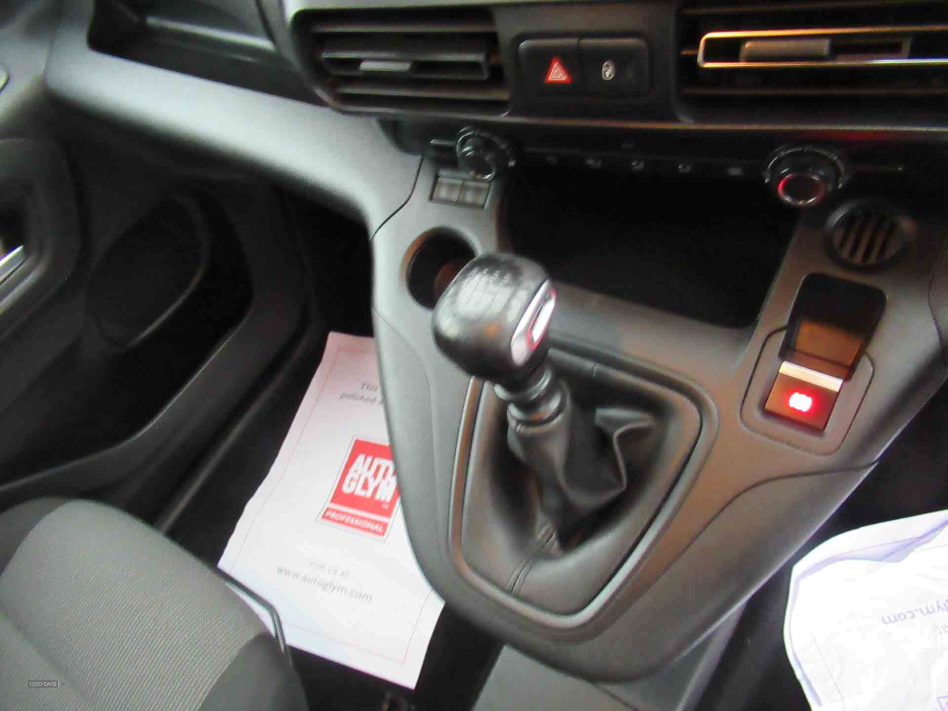 Centrally located instrument cluster with service due indicator and trip computer data, Electronic cruise control with speed limiter, Front and rear parking distance sensors, Gearshift indicator light, Instrumentation Speedometer, rev counter, fuel gauge with low fuel warning light and water temperature gauge warning light, Lights on audible warning, Multi-function trip computer with trip mileage, vehicle range, average speed, average and instantaneous fuel economy, Speed sensitive electric power assisted system, Surround rear vision camera, Steering wheel mounted audio controls, Automatic lighting control, Black door handles, Black door mirrors, Black front and rear bumpers, Body colour front and rear bumpers, Body colour sliding side access door rail cover, Door mirrors with power fold back, Electrically operated front windows with safety autoreverse one touch facility, Front fog lights, Hazard warning lights, LED Daytime running lights, Magic wash system, Manual headlight beam levelling, Rear fog lights, Reversing lights, Side protection moulding, Solar heat absorbing windscreen, Tinted windows, Twin electrically adjustable, heated door mirrors and manually folding door mirrors, Two speed windscreen wipers with variable intermittent wipe, Adjustable lumbar support, 12 volt electrical accessory socket centre console, 6 way adjustable height and reach drivers seats with manual lumbar adjustment and armrest, Cab heating system with six speed fan, Illuminated controls, four adjustable facia vents, windscreen demist vents and side window demist vents, Driver and front passenger sun visor and vanity mirror on rear of drivers sunvisor, Driver's top lidded glovebox, Fabric upholstery, Full width overhead storage shelf with ambient lighting, Large open storage pocket behind infotainment screen, Mistral grey fabric side bolsters, Open storage compartment below glovebox, Reach and rake adjustable steering column, Six Fixed floor mounted load restraint lashing eyes, Small open storage compartment behind gear lever, Two drinks holders in centre console, Two facia mounted drinks holders, Two large and two small open door pockets, Multimedia navi pro pack - Cargo, Sight and light Pack - Combo, Energy absorbing steering column, Side impact protection beams, Reinforced passenger safety cell and front and rear deformation zones, Deactivation switch for front passenger airbag and side impact airbag, Driver and front passengers side impact airbags, Drivers airbag, Drivers and front passengers lap belt pretensioner system, Front body lock diagonal seatbelt pretensioner system, Front passenger airbags, Front seatbelt force limiters, Height adjustable front seatbelts, 2 folding keys with integral remote control function, Central locking activation switch on drivers door, Electronically protected audio, Engine deadlock immobiliser, Locking wheel bolts, Remote central locking and deadlocks, Remote control ultrasonic security alarm system, Visible Vehicle Identification Number (VIN), Anti-lock braking, Anti-roll bar, Corner stability control, Electronic brake force distribution, Electronic stability programme, Engine drag torque control, Hill start assist, Independent MacPherson front suspension with gas pressure dampers and linear-rate coil springs, Rear torsion beam with gas pressure dampers and variable rate coil springs, Traction control, 16" 5 spoke alloy wheels, 16" alloy wheels, 6x16 5 spoke alloy wheels