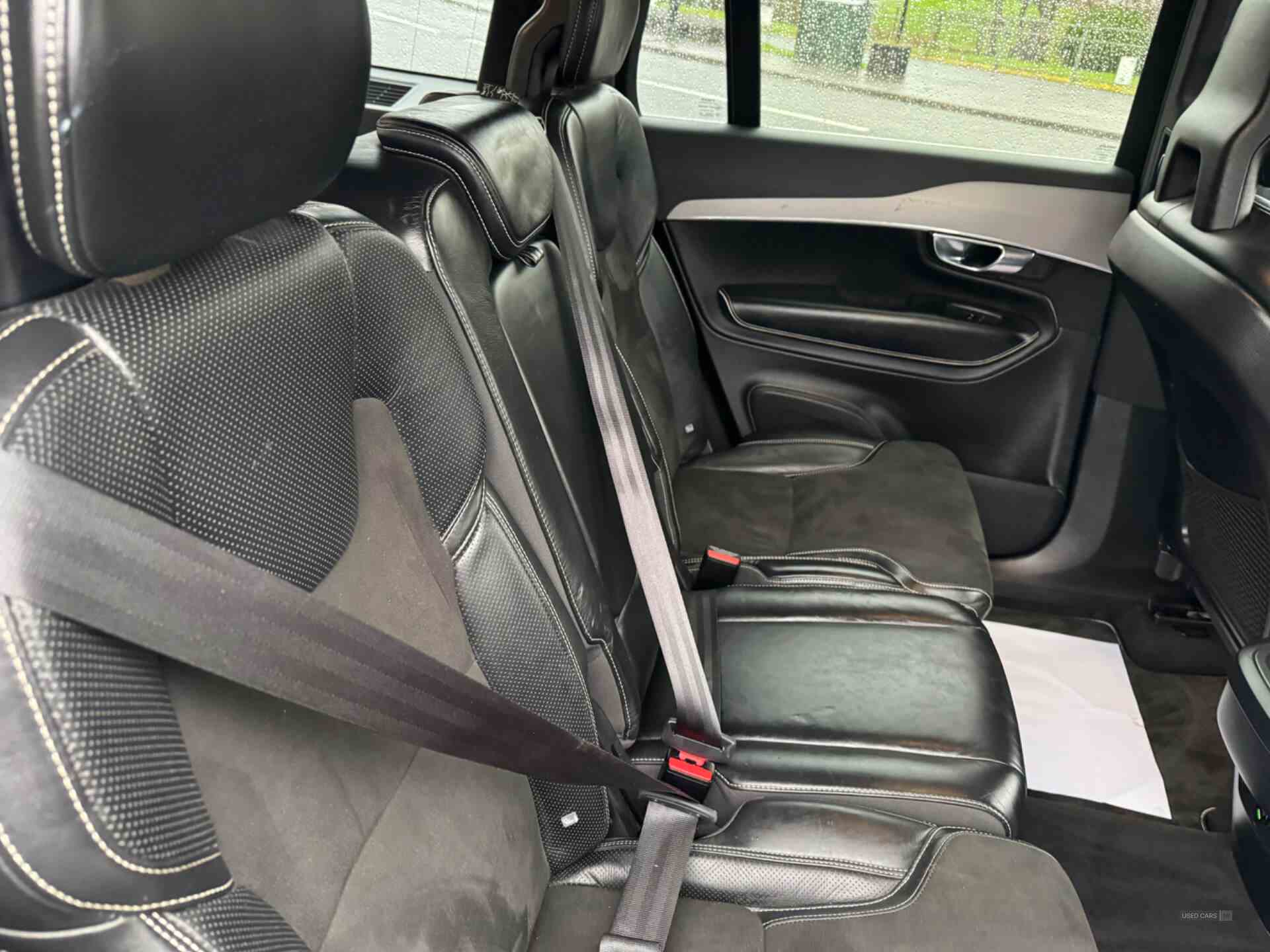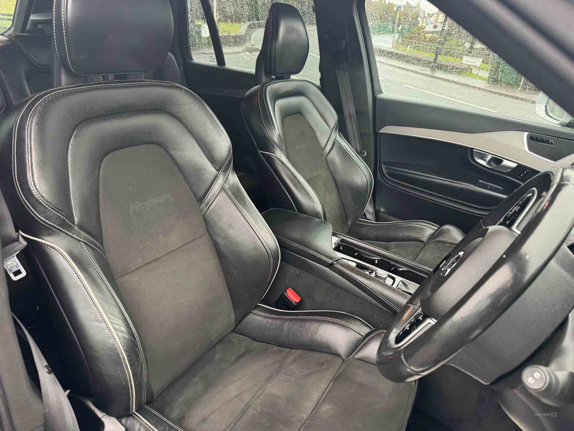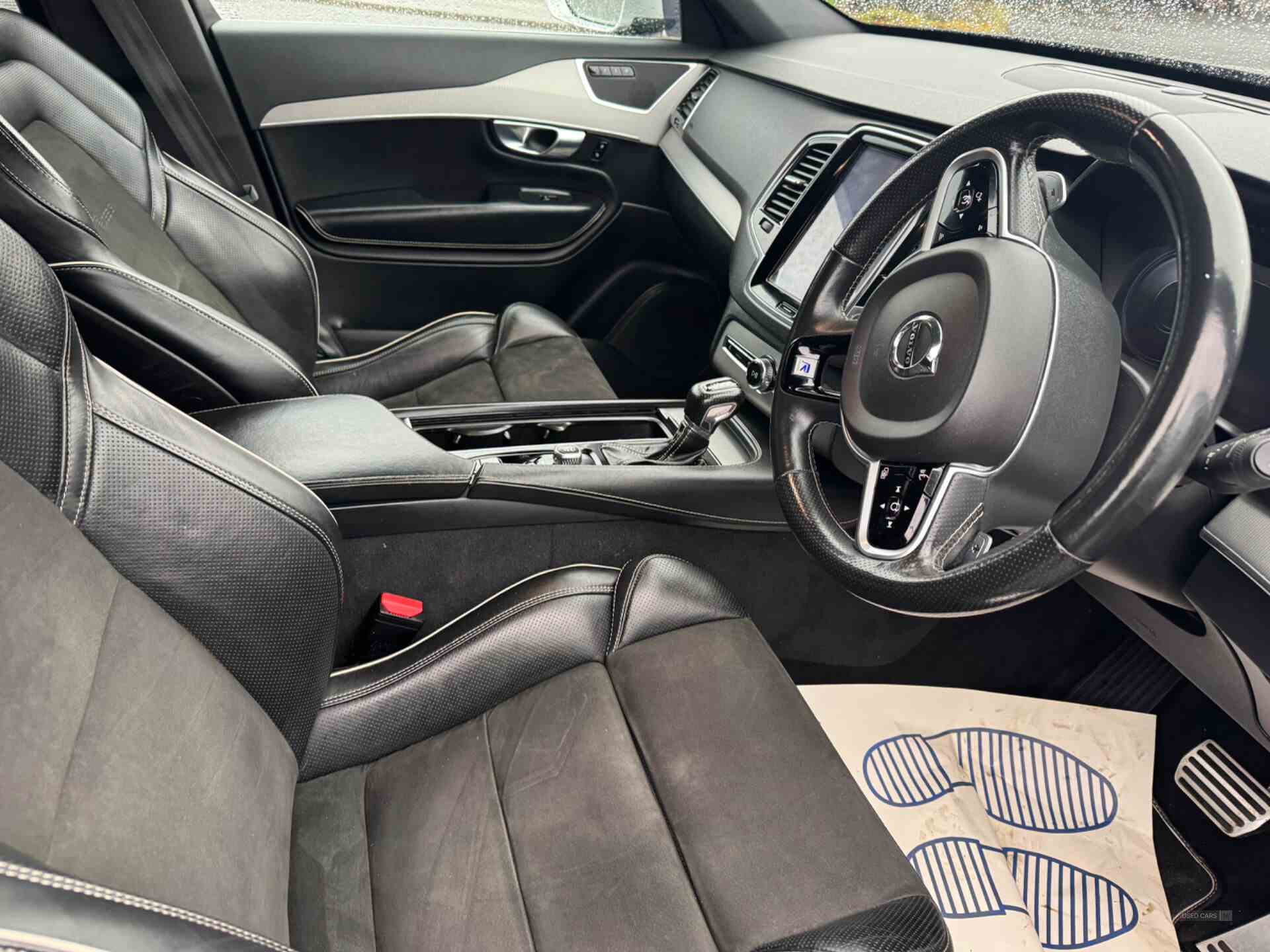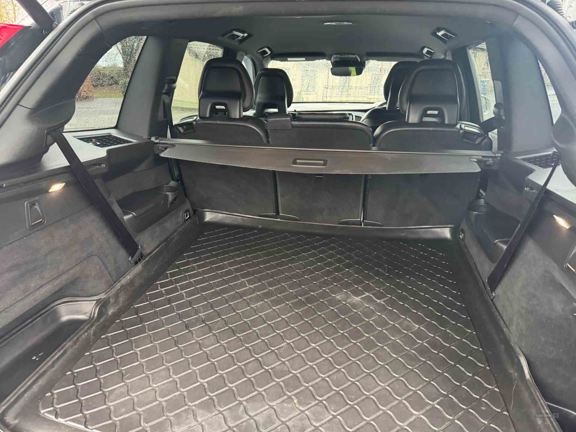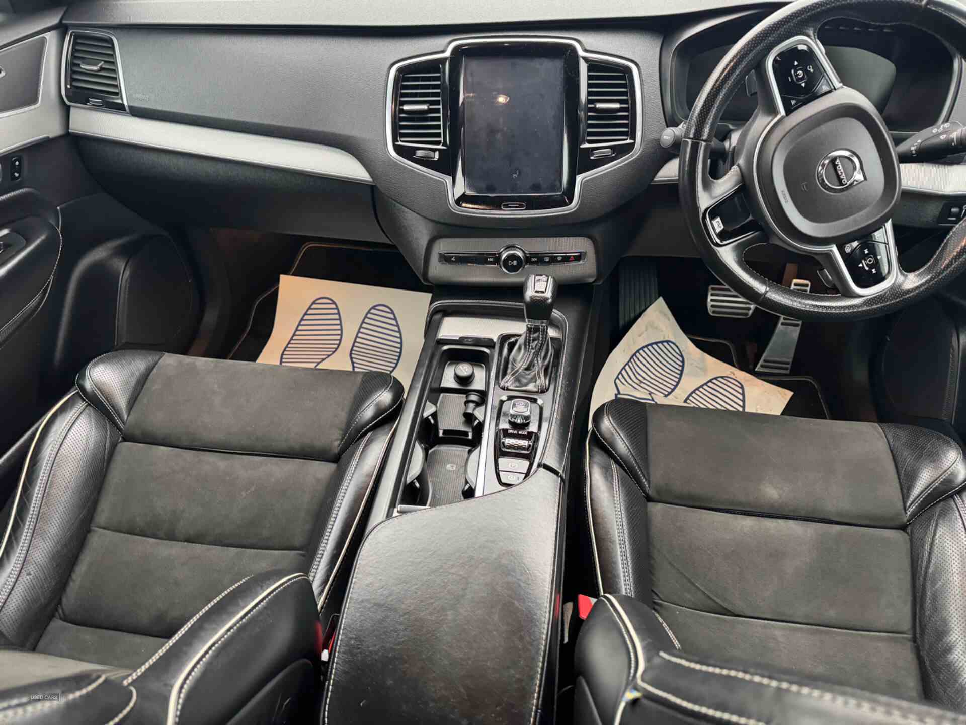 12.3" Active TFT crystal driver's instrument display, Adaptive cruise control with pilot assist, Bluetooth hands free telephone connection, Drive mode settings, adjustable steering wheel force + hill descent control, Forward collision warning, Handsfree power boot opening and closing, Lane departure warning with driver alert control, Oncoming Lane Mitigation, Power tailgate, Service interval indicator, Speed dependant power steering system, Speed limiter, Touch screen centre multi info display, Trip computer, Voice control system, Volvo on call, Wireless internet connection, DAB Digital radio, Adaptive brake lights, Auto dimming door mirrors, Auto dimming rear view mirror, Body colour bumpers, Cornering light, Dark tinted rear windows, Day running lights, Dual integrated exhaust pipes with high gloss black surround, Electric adjustable/heated/folding door mirrors, Front and rear electric windows, Headlamp levelling, High beam assist, High gloss black lower front bumper, High gloss black mesh grille, Home safe and approach lighting, Illuminated front and rear tread plates, Illuminated side steps, LED front fog lights, LED Headlights, Matt silver finish door mirrors, Puddle lights, Rain sensor windscreen wipers, Rear wash/wipe with intermittent wipe setting, Roof spoiler, Silk metal grille surround, Silk metal window trim, Silver roof rails, 12V power point in luggage area, 12V socket in centre console, 12V socket in rear tunnel console, 2 coat hooks, 2 individual folding 3rd row seats, 3 individual folding 2nd row seats, A-pillar parking ticket holder, Ambient lighting in door panels, B Pillar ventilation, Bright metal luggage threshold, Centre console storage box, Driver/passenger lumbar adjustment, Driver/passenger sunvisors and illuminated vanity mirrors, Electric front cushion extensions, Electric memory driver's seat + door mirror memory, Electrically adjustable passenger seat with memory, Front and rear centre armrests with cupholders, Front footwell illumination, Front headrests, Front/rear reading lights, Gearshift paddles, Grocery bag holder, Heated front seats, Height/reach adjustable steering column, Illuminated front cupholder, Illuminated front/rear door pockets, Illuminated glovebox with lock, Illuminated luggage compartment, Illuminated tailgate, Instrument panel illumination control, Isofix rear child seat preparation in 2nd row, Load cover, Multicolour theatre lights, Outboard armrest with cupholder and storage for 3rd row, Passenger seat electric height adjuster, Perforated leather gearknob, Perforated Leather Key Integrated Remote, Perforated leather steering wheel, Pollen filter, Rear footwell illumination, Rear headrests, Sports floor mats, Sports pedals, Steering wheel audio controls, Sun curtain - rear side doors, Underfloor stowage compartment, 7 three point seatbelts, ABS/EBD, City safety braking system, Drivers knee airbag, Dual stage Driver/Passenger Airbags, EBA, Electronic parking brake with auto hold, Front and rear curtain airbags, Front seat side impact airbags, Hill start assist, Inflatable curtain, Passenger airbag cut-off device, Pedestrian and Cyclist Detection, Road sign information display, Run off Road Protection, Seatbelt pre-tensioners, Seatbelt warning, STC - Stability and traction control, Tyre pressure monitoring system, Warning triangle and first aid kit, WHIPS whiplash protection system - front, Anti-theft alarm including immobiliser/volume sensor + level sensor, Keyless drive, Locking wheel nuts, Private locking, Remote central locking - doors and fuel cap, Touring chassis, 20" 5 spoke diamond cut/matt black alloy wheels, Tempa spare wheel