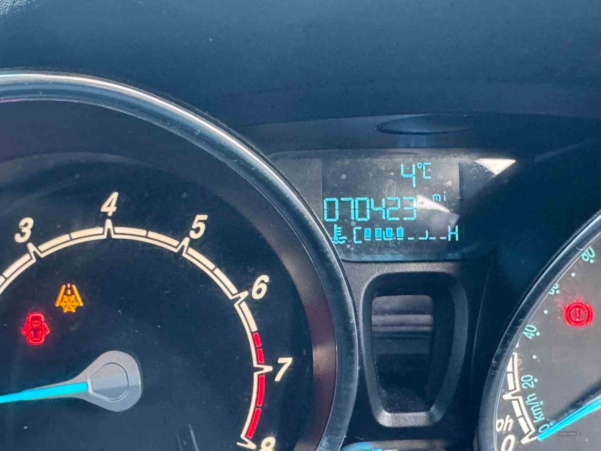 Electric power steering, SYNC Emergency Assistance, Trip computer, 6 speakers, Auxiliary input socket, DAB radio/CD and Ford SYNC Bluetooth connection with voice control, Steering wheel mounted controls, USB connection, Body colour door handles, Body colour electric adjustable heated door mirrors, Body colour tailgate handle, Chrome beltline, Chrome surround for front fog lights, Courtesy headlamp delay, Electric front windows/one touch facility, Front fog lights, LED daytime running lights, Quickclear heated windscreen, Rear wiper, Tinted glass, Upper front grille chrome surround, 3 spoke leather steering wheel, 60/40 split folding rear seat, Adjustable head restraints, Ambient lighting, Boot carpet, Cloth upholstery, Footwell illumination, Front map reading lights, Front seatback pockets, Illuminated glovebox, Leather trimmed handbrake handle, Load area light, Manual air conditioning, Manual seat adjustment, Pollen filter, Rake/reach adjustable steering wheel, 3 point rear seatbelts x3, ABS+EBA, Curtain airbags, Driver and passenger airbags, Drivers knee airbag, ESP + traction control, Front passenger airbag deactivation, Front side airbags, Hill start assist, MyKey system, Tyre pressure monitoring system, Immobiliser, Remote central locking