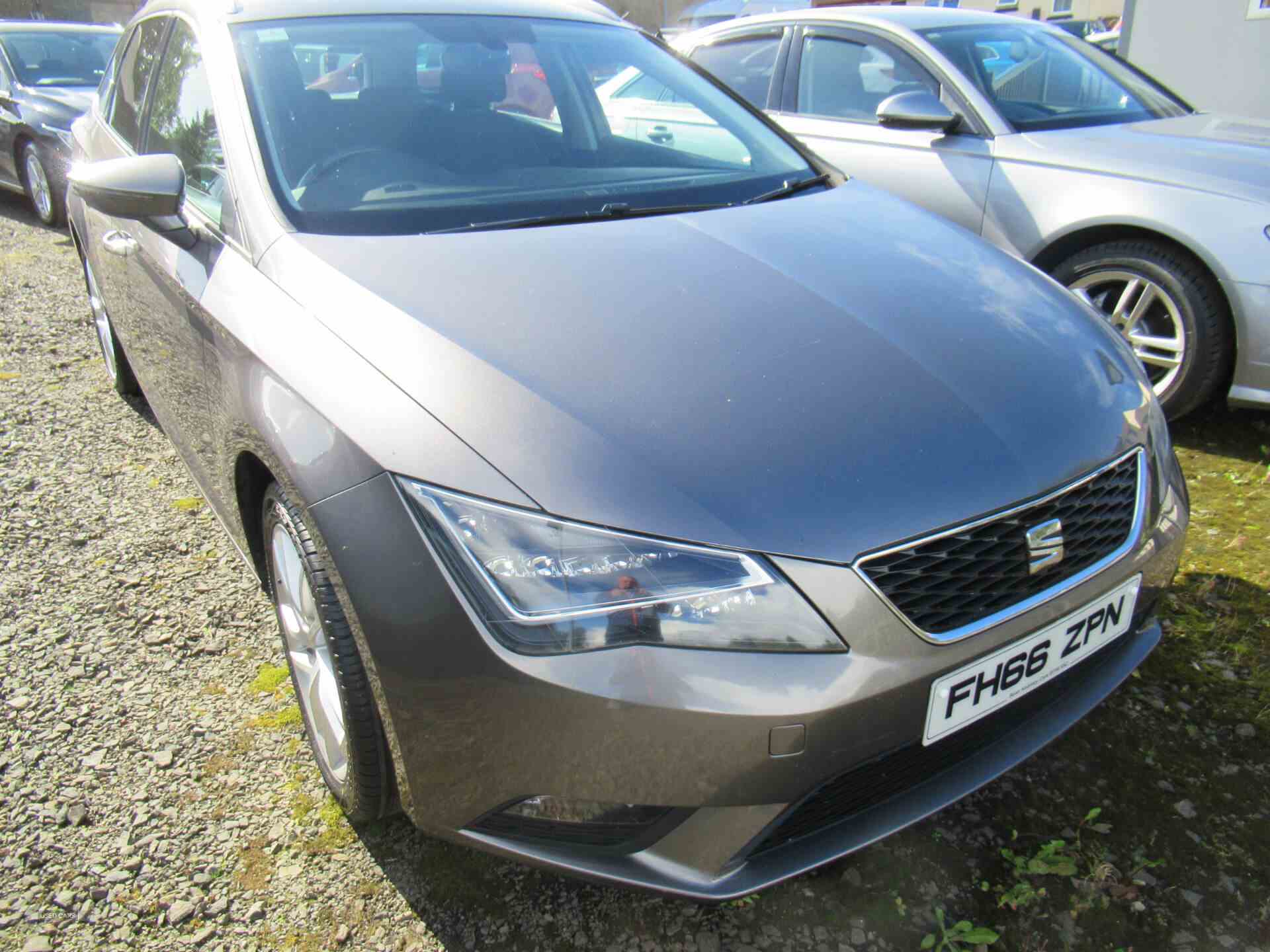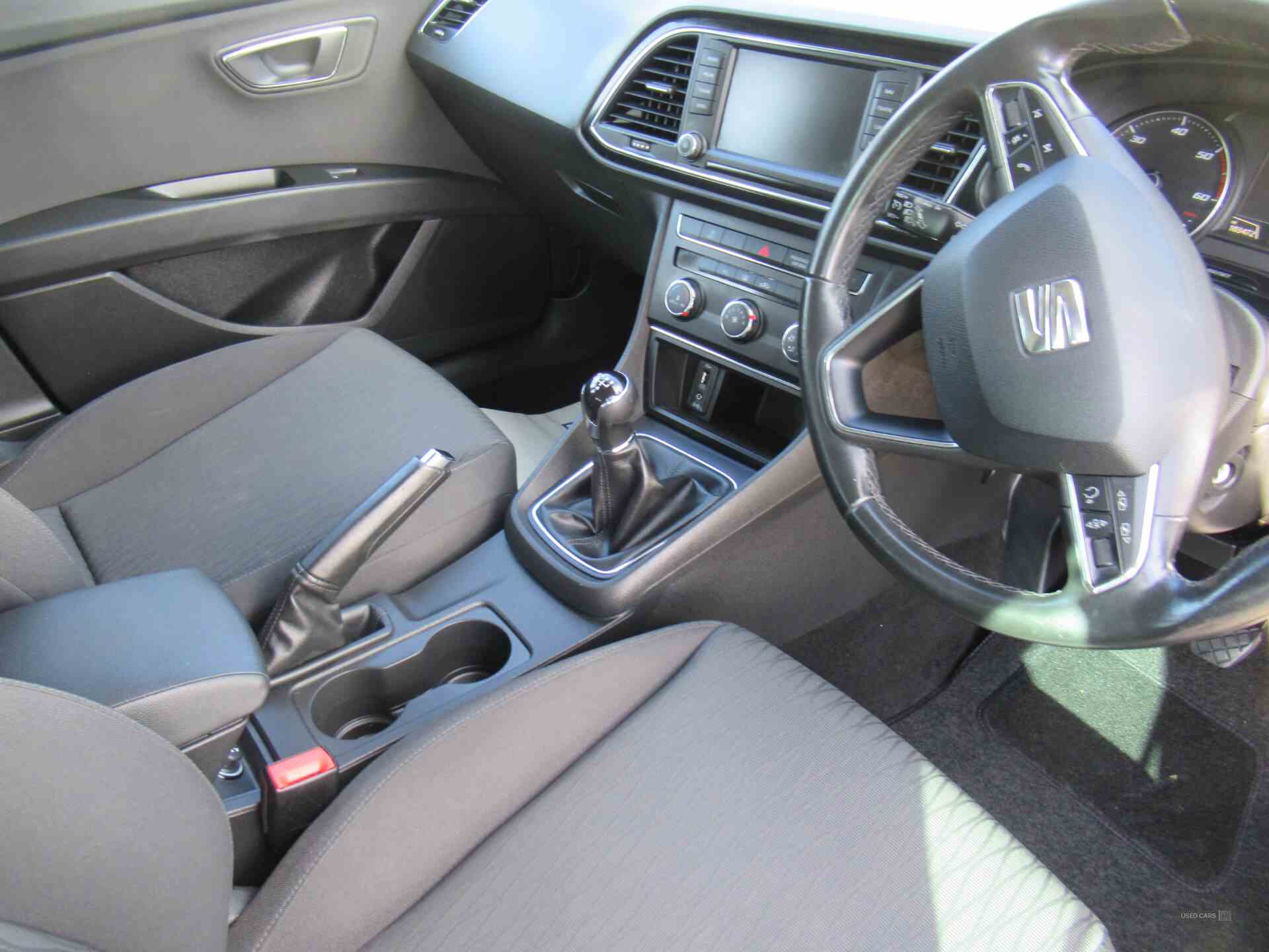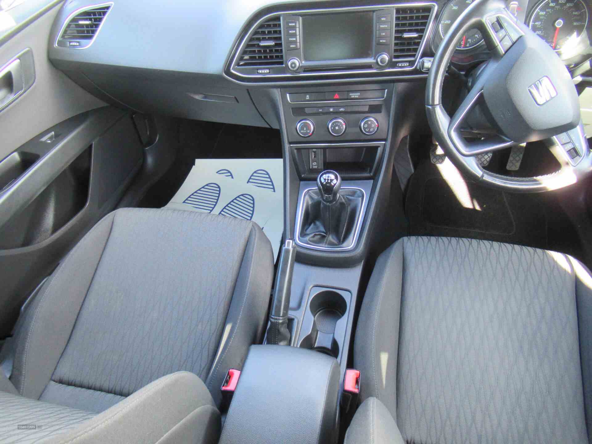 'Lights On' warning buzzer, 6.5" colour touchscreen with proximity sensor, Bluetooth Handsfree Phone Connection, Digital clock and outside temperature display, Low fuel warning light, Multi function display, Remote fuel flap release, SEAT logo boot release, Service interval indicator, Speed sensitive power steering, Touch screen display, Trip computer, Voice control system, Auxiliary input socket, Bluetooth audio streaming, DAB Digital radio, Radio/CD + MP3, SD card slot, Steering wheel mounted audio/phone controls, USB port, Body colour door handles, Body coloured bumpers, Body coloured door mirrors, Chrome roof rails, Chromed centre radiator grille surround, Cornering front fog lights, Dark tinted rear windows, Electric front/rear windows with one touch/anti pinch, Electric headlamp adjustment, Electrically adjustable door mirrors, Heated door mirrors, LED indicators in door mirrors, Rear wash/wipe, 12v power point in centre console, 12V power point in luggage area, 3 height adjustable rear headrests, Active head restraints, Additional heating and ventilation outlet in rear of centre console, Ambient lighting, Chrome loading sill, Cloth upholstery, Driver seat height/lumbar adjust, Driver/passenger sunvisors with illuminated vanity mirrors, Dust/pollen filter, Front adjustable head restraints, Front armrest with storage box, Front comfort seats, Front cupholders x 2, Front map reading lights, Front seatback pockets, Front/rear floor mats, Height/reach adjust steering wheel, Illuminated glovebox, Leather handbrake, Leather steering wheel and gear knob, Luggage tie-down hooks, Passenger seat height adjuster, Rear armrest, Rear reading lights, Rear top tether child seat ISOFIX attachment, Split folding rear seat, Storage boxes under front seats, Tonneau cover, Full LED headlight pack - Leon, Seat navigation pack - Leon SE/SE Dynamic, 3 point rear seatbelts x3, ABS + traction control, Child proof door locks, Collision mitigation braking system, Curtain airbags, Driver/Front Passenger airbags, Drivers knee airbag, ESP+EBA, Front seatbelt pretensioners, Front Seatbelt warning, Front side airbags, Hill hold control, Passenger airbag deactivation system, Tyre pressure monitoring system, 2 folding remote keys with window open/close function, Engine immobiliser, Locking wheel bolts, Remote central locking + deadlocks, Volumetric alarm with back up horn, Comfort suspension, XDS electronic differential lock, Chrome interior trim