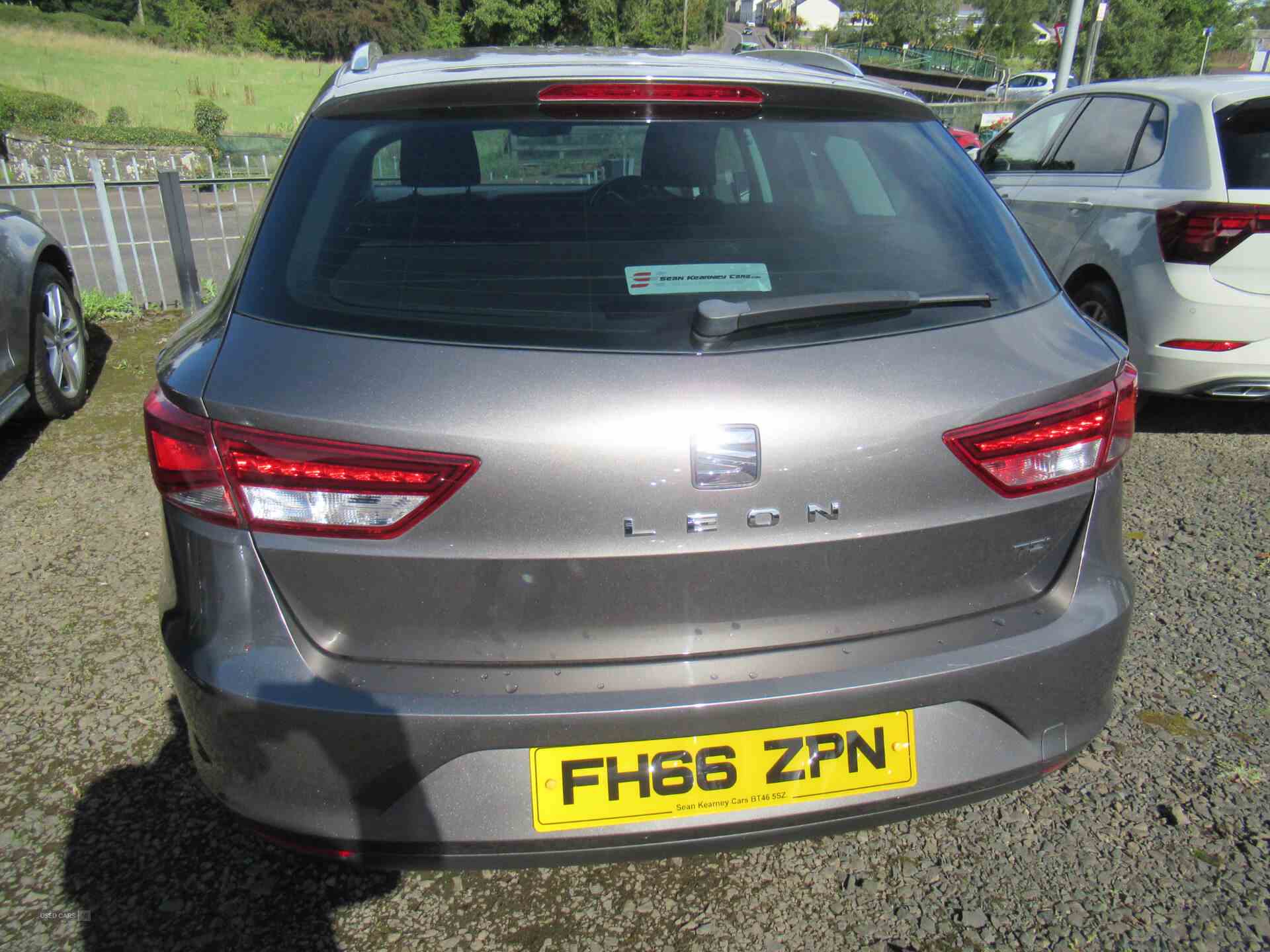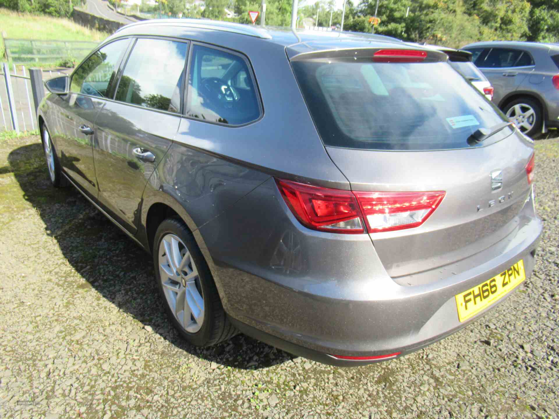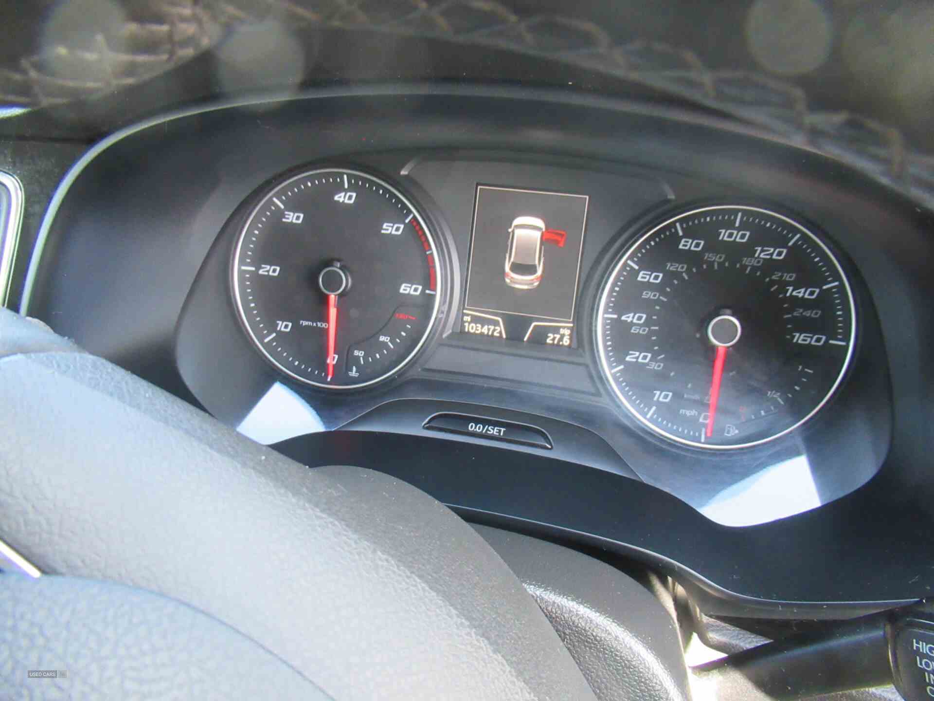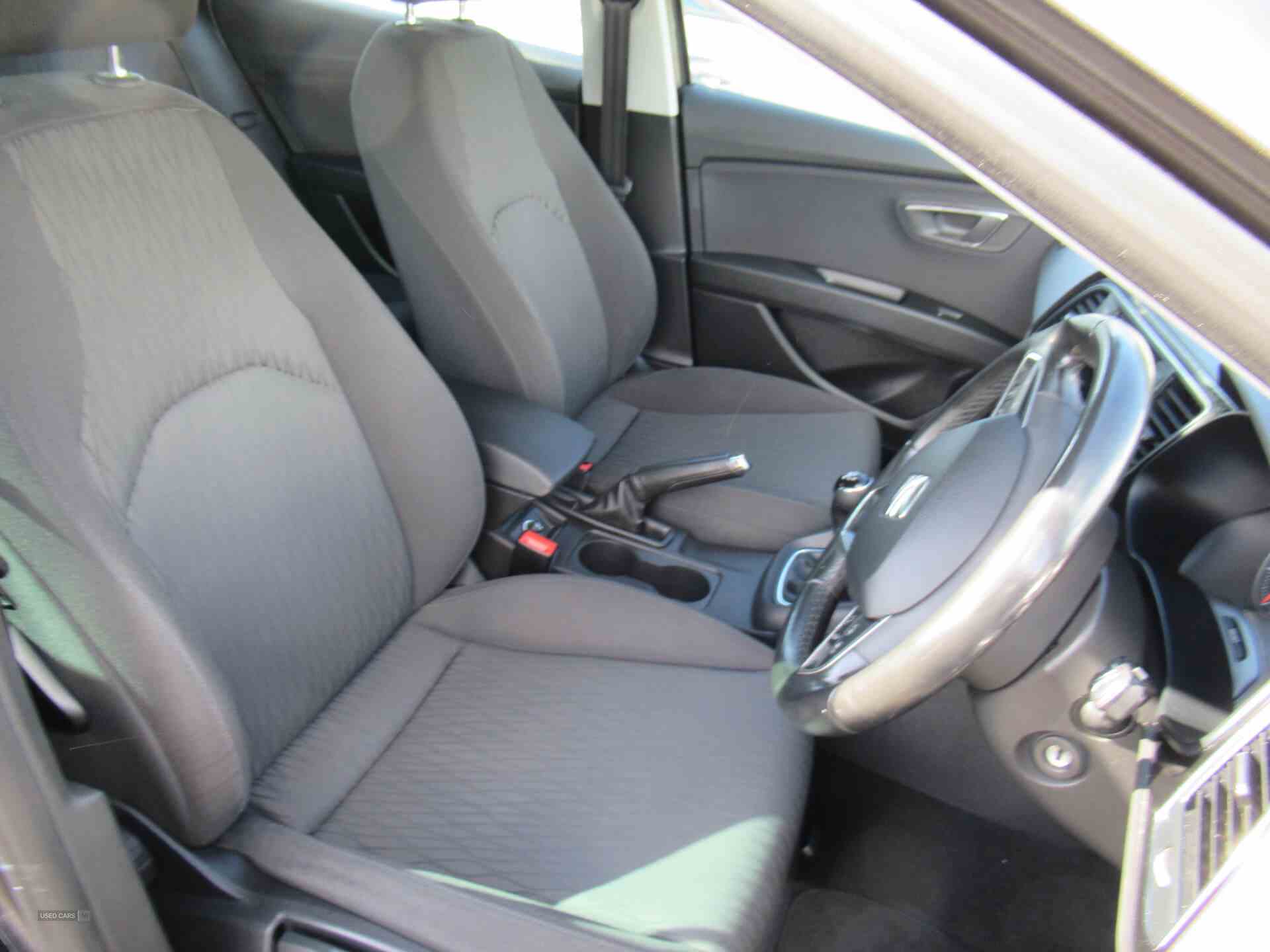 'Lights On' warning buzzer, 6.5" colour touchscreen with proximity sensor, Bluetooth Handsfree Phone Connection, Digital clock and outside temperature display, Low fuel warning light, Multi function display, Remote fuel flap release, SEAT logo boot release, Service interval indicator, Speed sensitive power steering, Touch screen display, Trip computer, Voice control system, Auxiliary input socket, Bluetooth audio streaming, DAB Digital radio, Radio/CD + MP3, SD card slot, Steering wheel mounted audio/phone controls, USB port, Body colour door handles, Body coloured bumpers, Body coloured door mirrors, Chrome roof rails, Chromed centre radiator grille surround, Cornering front fog lights, Dark tinted rear windows, Electric front/rear windows with one touch/anti pinch, Electric headlamp adjustment, Electrically adjustable door mirrors, Heated door mirrors, LED indicators in door mirrors, Rear wash/wipe, 12v power point in centre console, 12V power point in luggage area, 3 height adjustable rear headrests, Active head restraints, Additional heating and ventilation outlet in rear of centre console, Ambient lighting, Chrome loading sill, Cloth upholstery, Driver seat height/lumbar adjust, Driver/passenger sunvisors with illuminated vanity mirrors, Dust/pollen filter, Front adjustable head restraints, Front armrest with storage box, Front comfort seats, Front cupholders x 2, Front map reading lights, Front seatback pockets, Front/rear floor mats, Height/reach adjust steering wheel, Illuminated glovebox, Leather handbrake, Leather steering wheel and gear knob, Luggage tie-down hooks, Passenger seat height adjuster, Rear armrest, Rear reading lights, Rear top tether child seat ISOFIX attachment, Split folding rear seat, Storage boxes under front seats, Tonneau cover, Full LED headlight pack - Leon, Seat navigation pack - Leon SE/SE Dynamic, 3 point rear seatbelts x3, ABS + traction control, Child proof door locks, Collision mitigation braking system, Curtain airbags, Driver/Front Passenger airbags, Drivers knee airbag, ESP+EBA, Front seatbelt pretensioners, Front Seatbelt warning, Front side airbags, Hill hold control, Passenger airbag deactivation system, Tyre pressure monitoring system, 2 folding remote keys with window open/close function, Engine immobiliser, Locking wheel bolts, Remote central locking + deadlocks, Volumetric alarm with back up horn, Comfort suspension, XDS electronic differential lock, Chrome interior trim