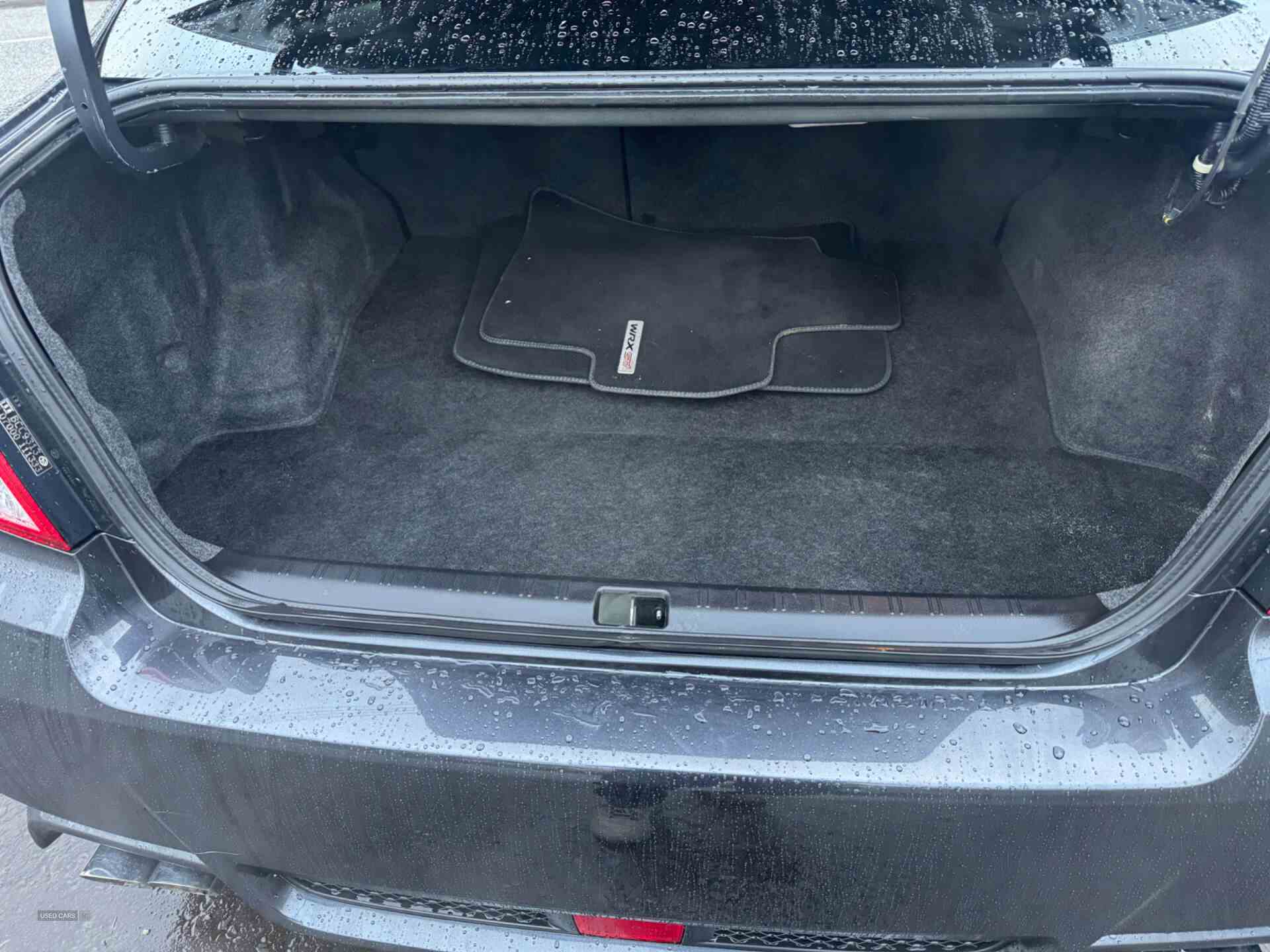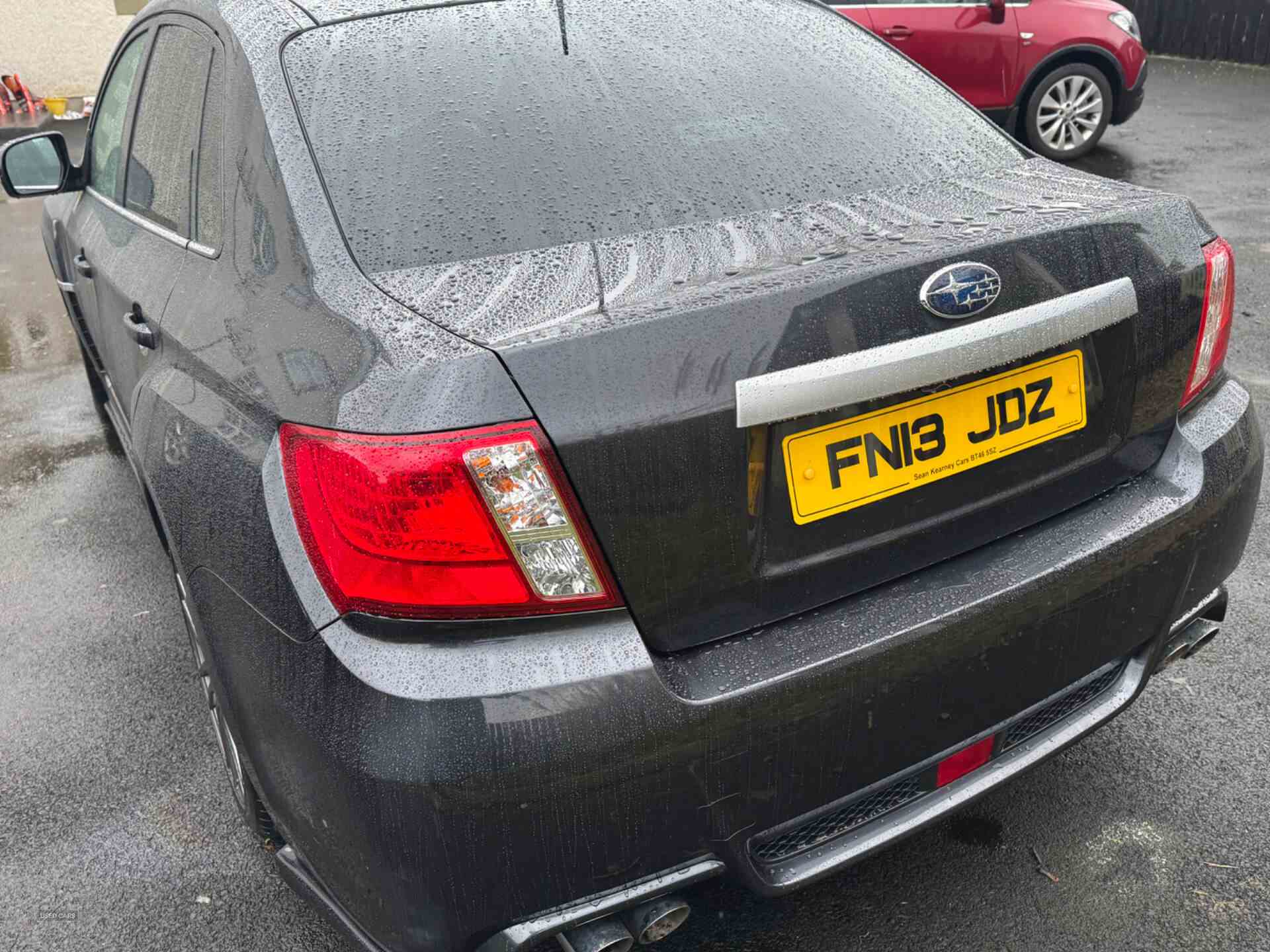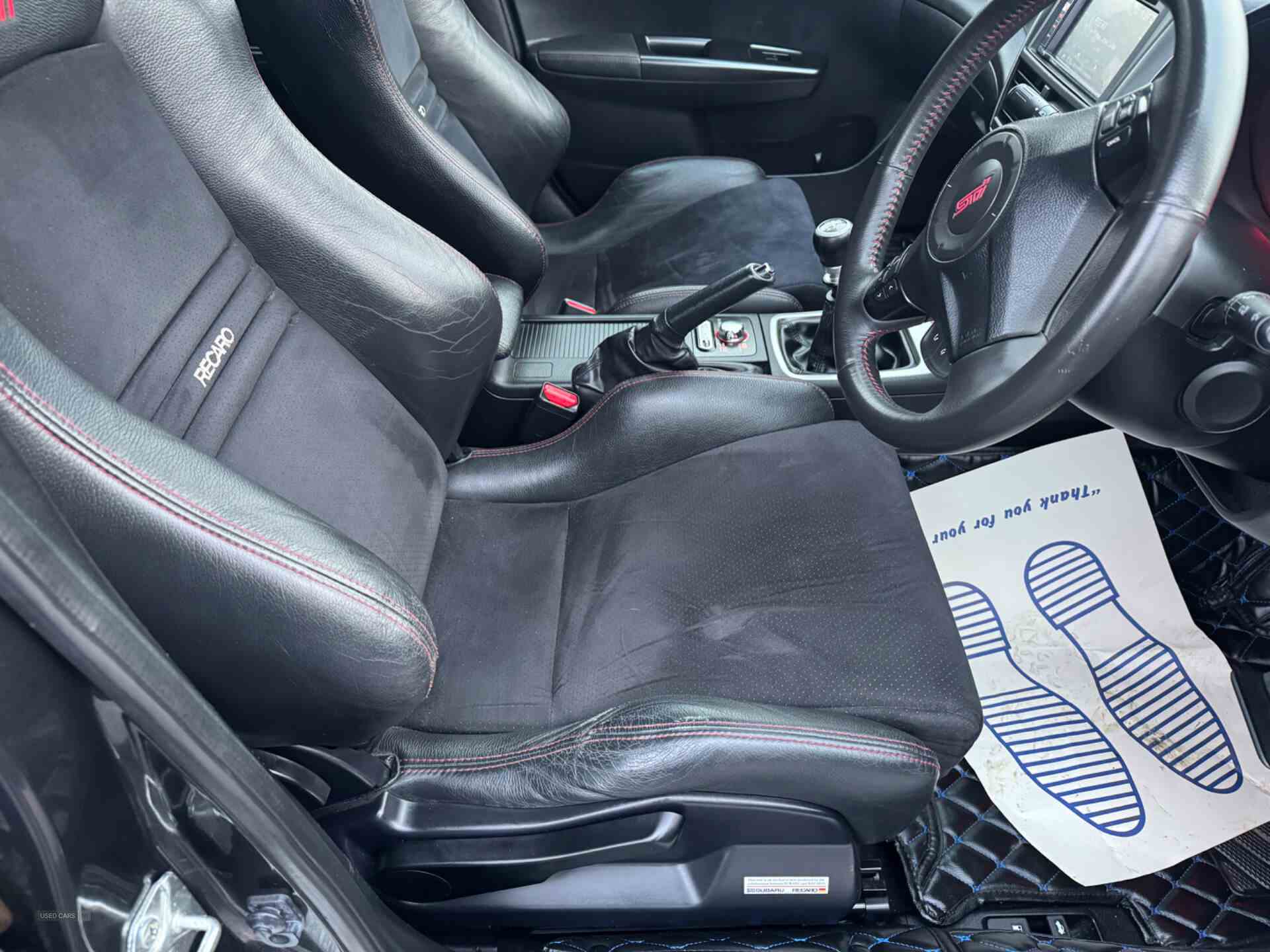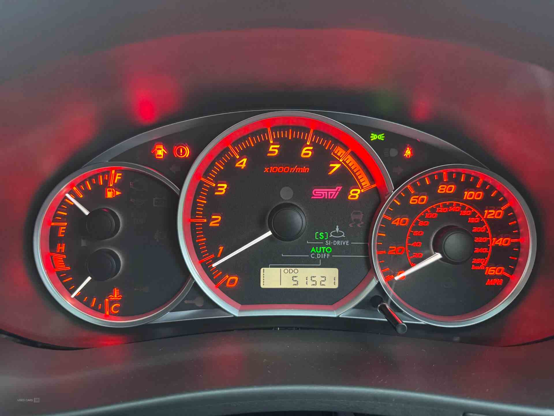 Bluetooth system, Cruise control, Electric boot release, Electroluminescent combination meter, Interior fuel flap release, Outside temperature gauge, Speed sensitive power steering, Trip computer, 10 speakers, Auxiliary socket for external MP3 player, Radio/CD + MP3, Steering wheel mounted audio/telephone controls, Colour coded bumpers, Colour coded door handles, Colour coded door mirrors, Electric/heated/folding door mirrors, Front and rear electric windows, Front fog lamps, Heated windscreen, One touch facility on driver's window, Pop-up headlight washers, Rear privacy glass, Roof rack preparation, Side sill spoilers, Twin chrome exhaust tailpipes x2, Variable intermittent front wash/wipe, Windscreen wiper de-icer, Xenon headlamps with auto levelling, 60/40 split folding rear seat, Air filter, Alcantara/leather upholstery, Aluminium pedals, Automatic air conditioning, Boot lamp, Driver seat height adjust, Driver/passenger vanity mirrors with covers, Front centre console with armrest, storage + dual cupholders, Front door pockets with bottle holders, Front head restraints, Front map reading lights, Height adjustable front seatbelts with pre-tensioners + clamp, Illuminated centre tray, Isofix child seat attachment, Leather gearknob and handbrake lever, Leather steering wheel with red stitching, Rear door pockets with bottle holders, Rear headrests, Rear passenger heating ducts, Rear window demister, Recaro front sports seats with red stitching, Tilt/reach adjustable steering wheel, Two 12V accessory power outlets, ABS/EBD, Curtain airbags, Driver and passenger airbags, Driver seatbelt warning indicator, Emergency brake assist, Front side airbags, Hill start assist, Rear child proof door locks, Three 3 point rear seatbelts, Keyless entry, Remote central locking + deadlocks, Remote Thatcham Cat 1 alarm/immobiliser, Satellite security tracking system, Sports suspension, SVDC - Subaru Vehicle Dynamics Control, Dark metallic effect interior trim, 18" 7 twin spoke alloy wheels, Space saver spare wheel