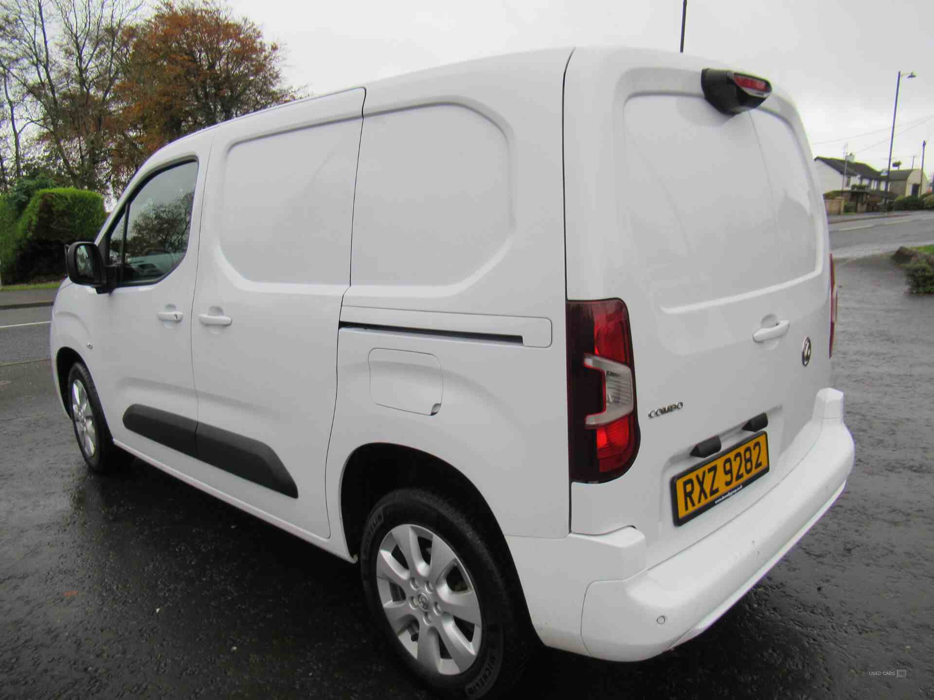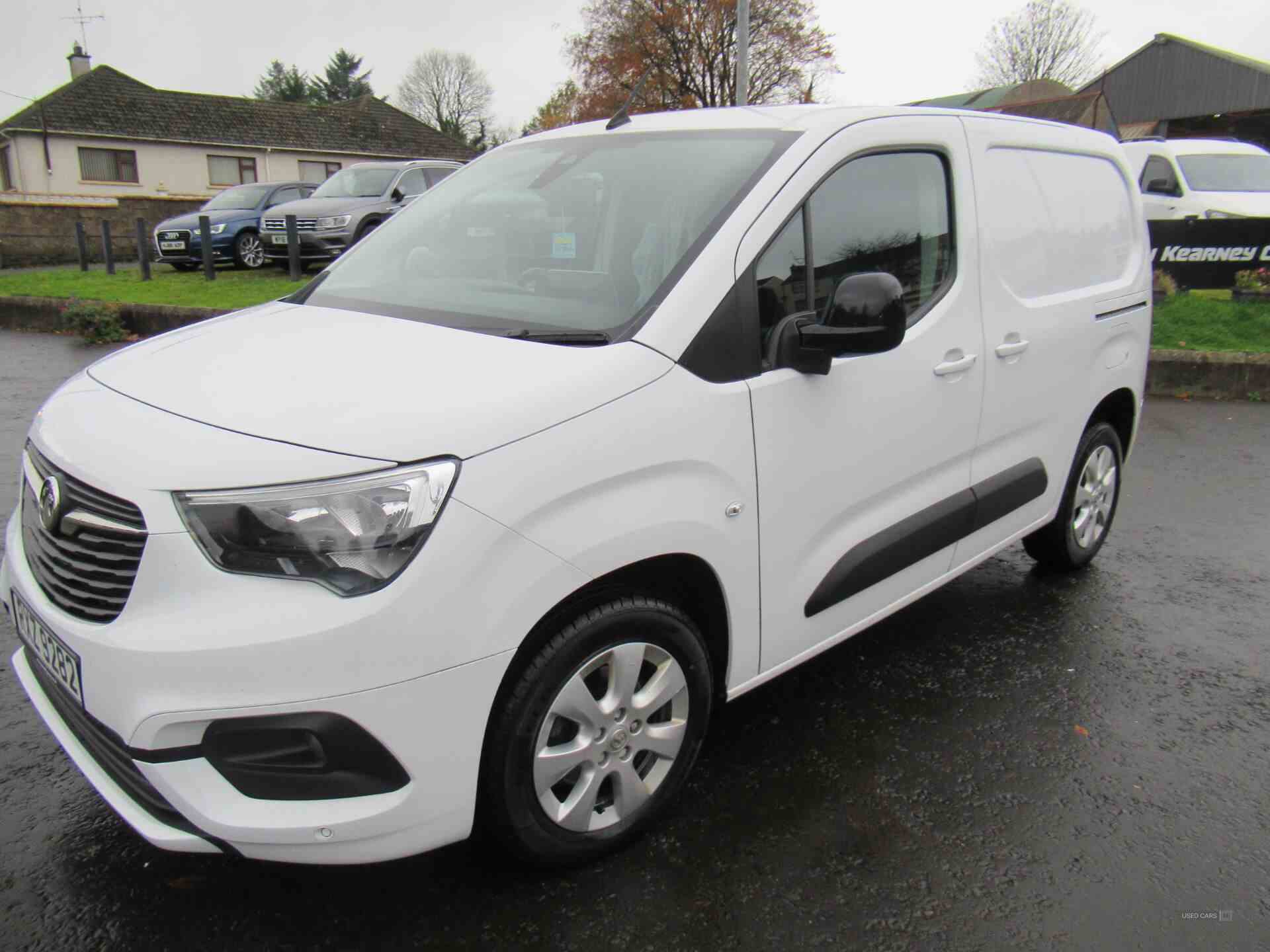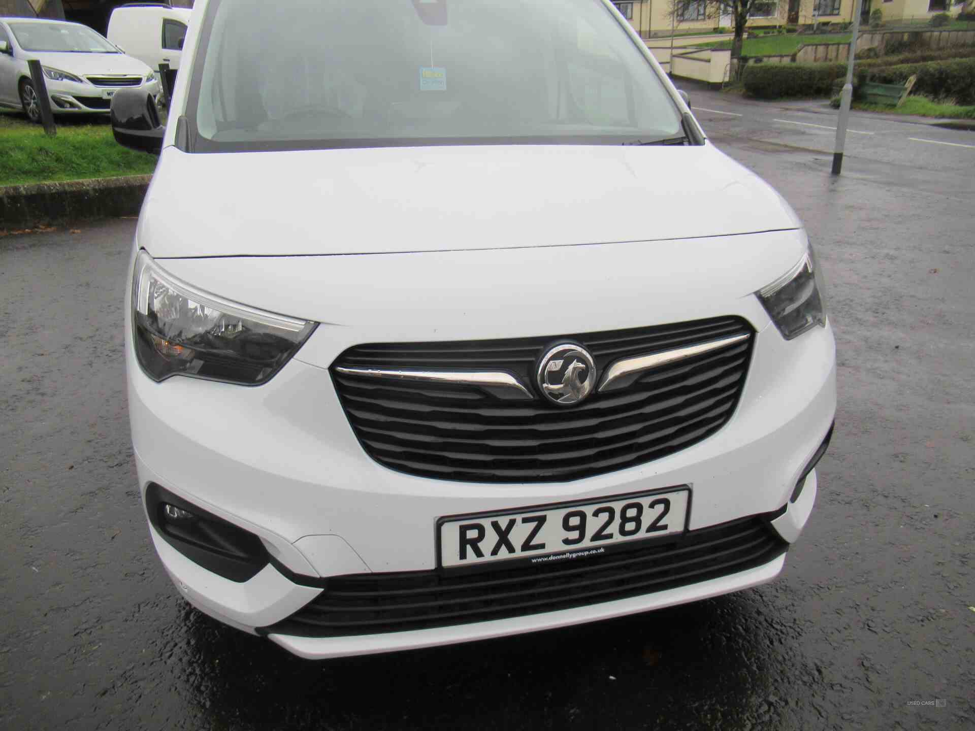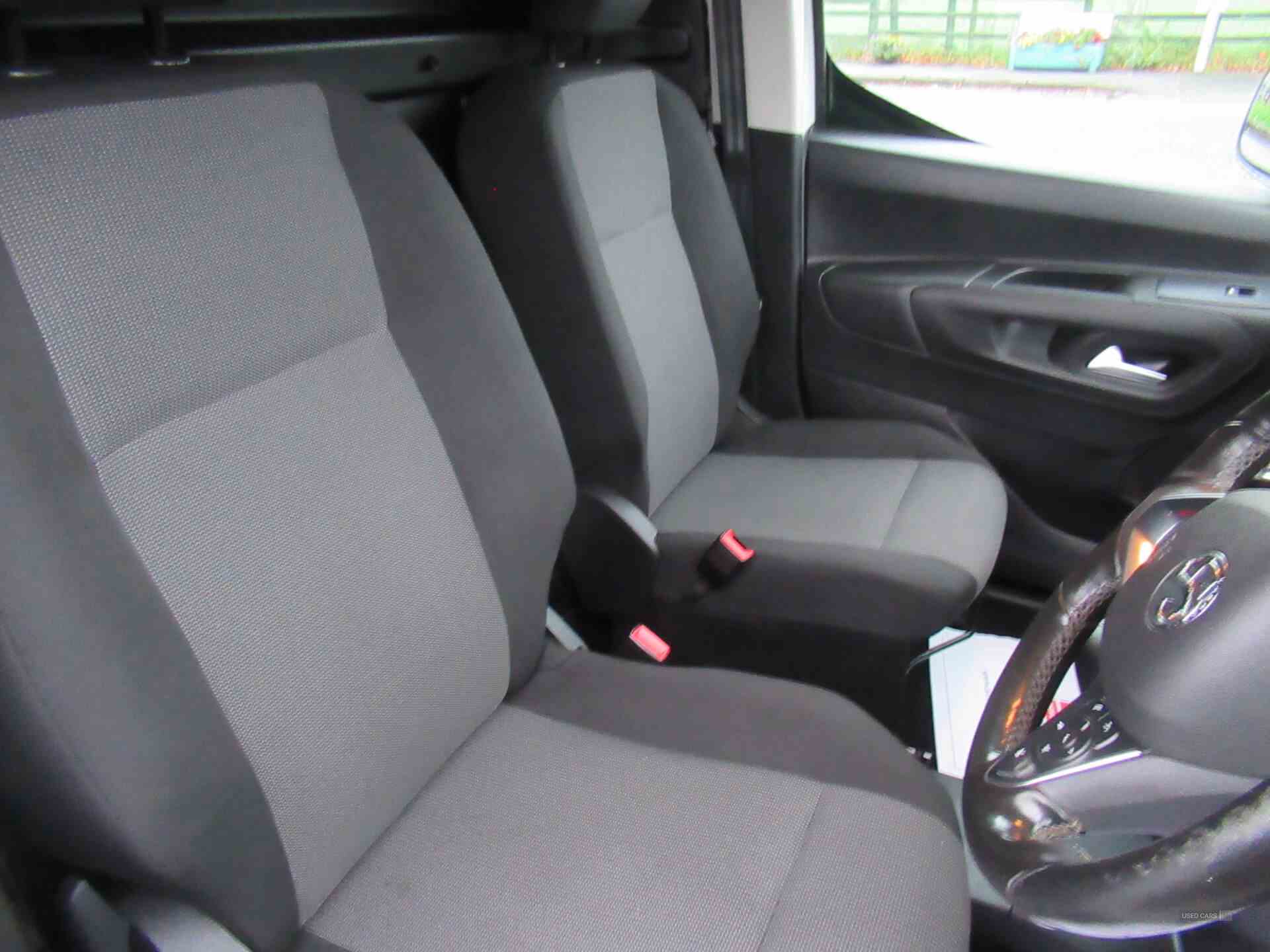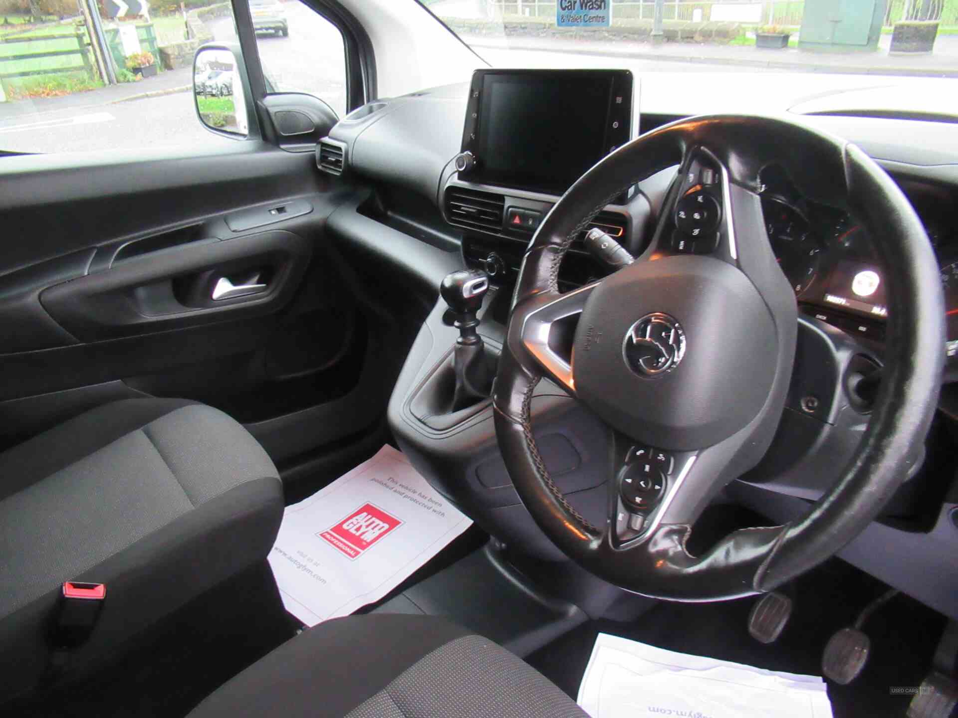 Centrally located instrument cluster with service due indicator and trip computer data, Electronic cruise control with speed limiter, Front and rear parking distance sensors, Gearshift indicator light, Instrumentation Speedometer, rev counter, fuel gauge with low fuel warning light and water temperature gauge warning light, Lights on audible warning, Multi-function trip computer with trip mileage, vehicle range, average speed, average and instantaneous fuel economy, Speed sensitive electric power assisted system, Surround rear vision camera, Steering wheel mounted audio controls, Automatic lighting control, Black door handles, Black door mirrors, Black front and rear bumpers, Body colour front and rear bumpers, Body colour sliding side access door rail cover, Door mirrors with power fold back, Electrically operated front windows with safety autoreverse one touch facility, Front fog lights, Hazard warning lights, LED Daytime running lights, Magic wash system, Manual headlight beam levelling, Rear fog lights, Reversing lights, Side protection moulding, Solar heat absorbing windscreen, Tinted windows, Twin electrically adjustable, heated door mirrors and manually folding door mirrors, Two speed windscreen wipers with variable intermittent wipe, Adjustable lumbar support, 12 volt electrical accessory socket centre console, 6 way adjustable height and reach drivers seats with manual lumbar adjustment and armrest, Cab heating system with six speed fan, Illuminated controls, four adjustable facia vents, windscreen demist vents and side window demist vents, Driver and front passenger sun visor and vanity mirror on rear of drivers sunvisor, Driver's top lidded glovebox, Fabric upholstery, Full width overhead storage shelf with ambient lighting, Large open storage pocket behind infotainment screen, Mistral grey fabric side bolsters, Open storage compartment below glovebox, Reach and rake adjustable steering column, Six Fixed floor mounted load restraint lashing eyes, Small open storage compartment behind gear lever, Two drinks holders in centre console, Two facia mounted drinks holders, Two large and two small open door pockets, Multimedia navi pro pack - Cargo, Sight and light Pack - Combo, Energy absorbing steering column, Side impact protection beams, Reinforced passenger safety cell and front and rear deformation zones, Deactivation switch for front passenger airbag and side impact airbag, Driver and front passengers side impact airbags, Drivers airbag, Drivers and front passengers lap belt pretensioner system, Front body lock diagonal seatbelt pretensioner system, Front passenger airbags, Front seatbelt force limiters, Height adjustable front seatbelts, 2 folding keys with integral remote control function, Central locking activation switch on drivers door, Electronically protected audio, Engine deadlock immobiliser, Locking wheel bolts, Remote central locking and deadlocks, Remote control ultrasonic security alarm system, Visible Vehicle Identification Number (VIN), Anti-lock braking, Anti-roll bar, Corner stability control, Electronic brake force distribution, Electronic stability programme, Engine drag torque control, Hill start assist, Independent MacPherson front suspension with gas pressure dampers and linear-rate coil springs, Rear torsion beam with gas pressure dampers and variable rate coil springs, Traction control, 16" 5 spoke alloy wheels, 16" alloy wheels, 6x16 5 spoke alloy wheels