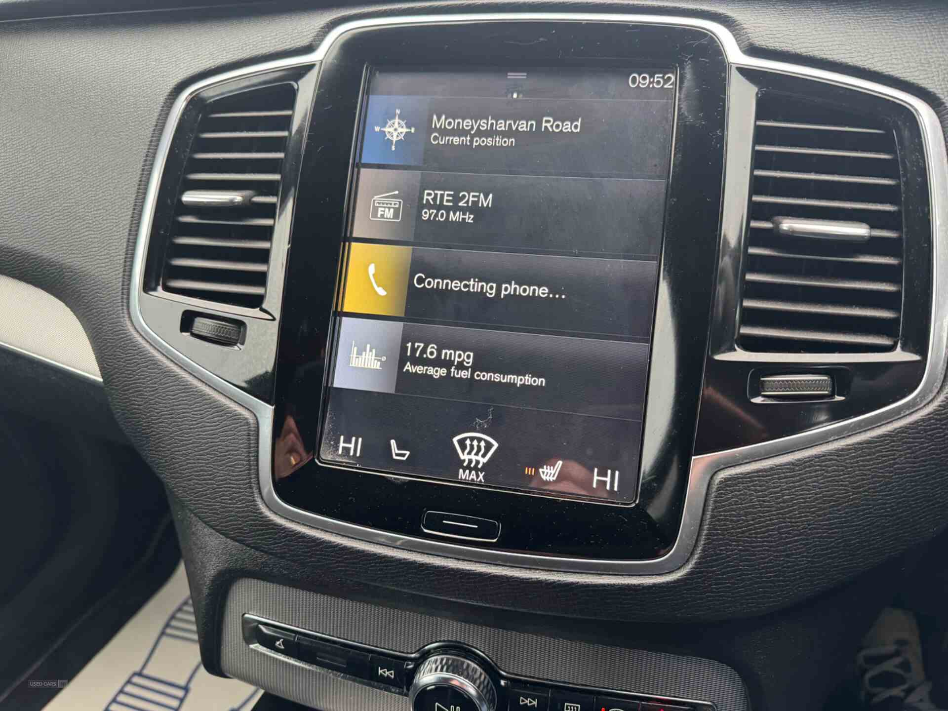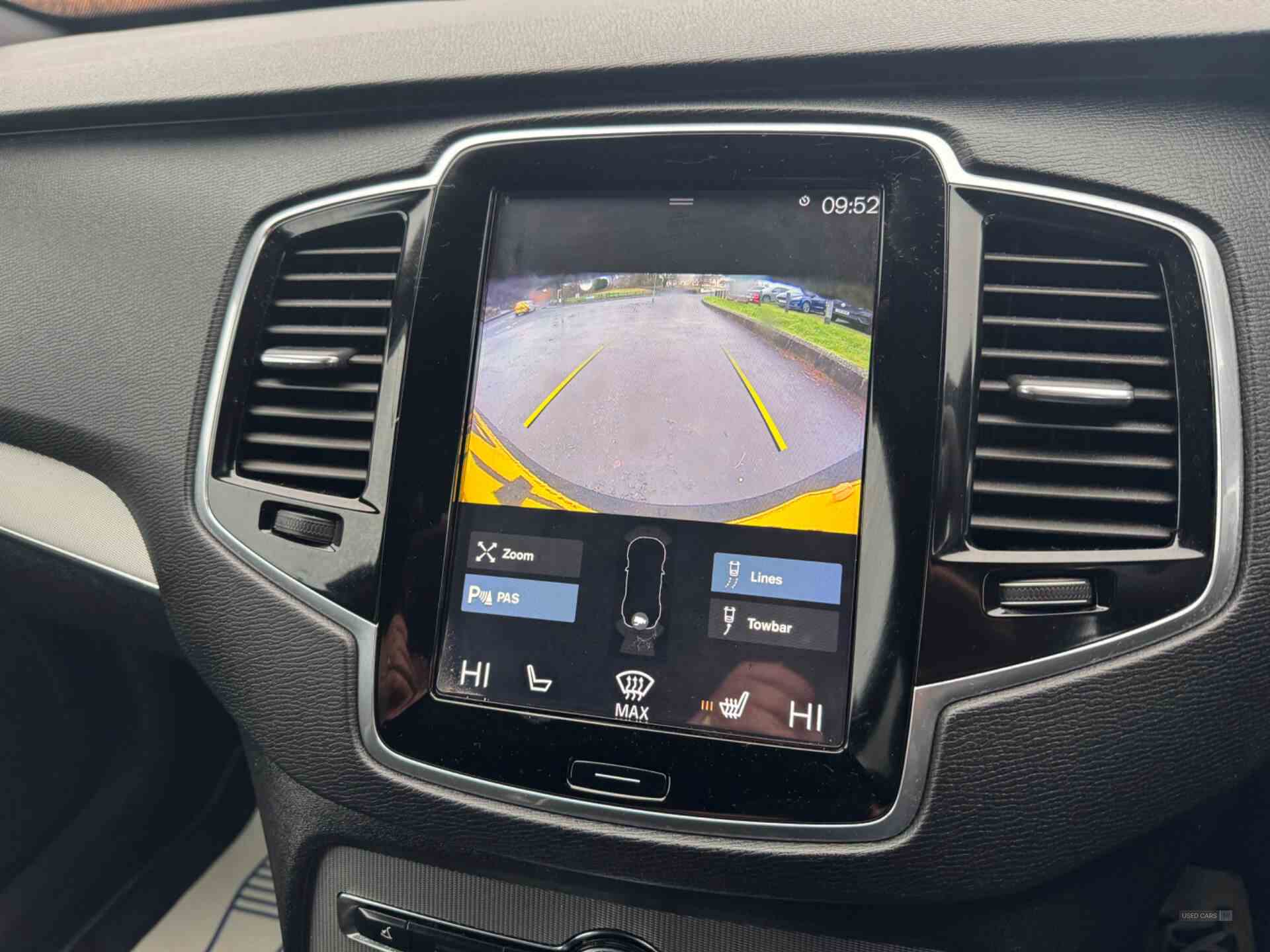 12.3" Active TFT crystal driver's instrument display, Adaptive cruise control with pilot assist, Bluetooth hands free telephone connection, Drive mode settings, adjustable steering wheel force + hill descent control, Forward collision warning, Handsfree power boot opening and closing, Lane departure warning with driver alert control, Oncoming Lane Mitigation, Power tailgate, Service interval indicator, Speed dependant power steering system, Speed limiter, Touch screen centre multi info display, Trip computer, Voice control system, Volvo on call, Wireless internet connection, DAB Digital radio, Adaptive brake lights, Auto dimming door mirrors, Auto dimming rear view mirror, Body colour bumpers, Cornering light, Dark tinted rear windows, Day running lights, Dual integrated exhaust pipes with high gloss black surround, Electric adjustable/heated/folding door mirrors, Front and rear electric windows, Headlamp levelling, High beam assist, High gloss black lower front bumper, High gloss black mesh grille, Home safe and approach lighting, Illuminated front and rear tread plates, Illuminated side steps, LED front fog lights, LED Headlights, Matt silver finish door mirrors, Puddle lights, Rain sensor windscreen wipers, Rear wash/wipe with intermittent wipe setting, Roof spoiler, Silk metal grille surround, Silk metal window trim, Silver roof rails, 12V power point in luggage area, 12V socket in centre console, 12V socket in rear tunnel console, 2 coat hooks, 2 individual folding 3rd row seats, 3 individual folding 2nd row seats, A-pillar parking ticket holder, Ambient lighting in door panels, B Pillar ventilation, Bright metal luggage threshold, Centre console storage box, Driver/passenger lumbar adjustment, Driver/passenger sunvisors and illuminated vanity mirrors, Electric front cushion extensions, Electric memory driver's seat + door mirror memory, Electrically adjustable passenger seat with memory, Front and rear centre armrests with cupholders, Front footwell illumination, Front headrests, Front/rear reading lights, Gearshift paddles, Grocery bag holder, Heated front seats, Height/reach adjustable steering column, Illuminated front cupholder, Illuminated front/rear door pockets, Illuminated glovebox with lock, Illuminated luggage compartment, Illuminated tailgate, Instrument panel illumination control, Isofix rear child seat preparation in 2nd row, Load cover, Multicolour theatre lights, Outboard armrest with cupholder and storage for 3rd row, Passenger seat electric height adjuster, Perforated leather gearknob, Perforated Leather Key Integrated Remote, Perforated leather steering wheel, Pollen filter, Rear footwell illumination, Rear headrests, Sports floor mats, Sports pedals, Steering wheel audio controls, Sun curtain - rear side doors, Underfloor stowage compartment, 7 three point seatbelts, ABS/EBD, City safety braking system, Drivers knee airbag, Dual stage Driver/Passenger Airbags, EBA, Electronic parking brake with auto hold, Front and rear curtain airbags, Front seat side impact airbags, Hill start assist, Inflatable curtain, Passenger airbag cut-off device, Pedestrian and Cyclist Detection, Road sign information display, Run off Road Protection, Seatbelt pre-tensioners, Seatbelt warning, STC - Stability and traction control, Tyre pressure monitoring system, Warning triangle and first aid kit, WHIPS whiplash protection system - front, Anti-theft alarm including immobiliser/volume sensor + level sensor, Keyless drive, Locking wheel nuts, Private locking, Remote central locking - doors and fuel cap, Touring chassis, 20" 5 spoke diamond cut/matt black alloy wheels, Tempa spare wheel
